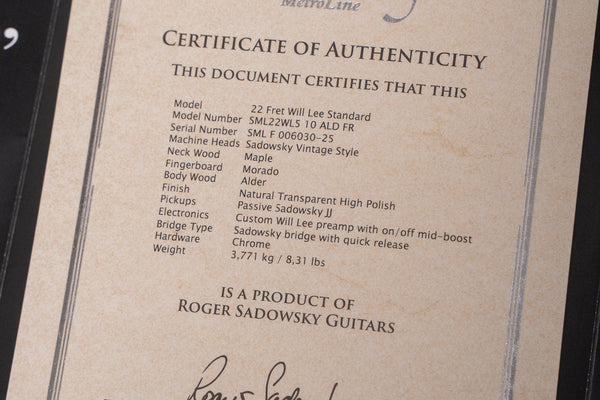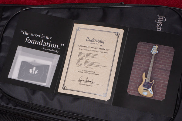 Sadowsky is a high-end New York brand whose clientele includes top musicians such as Marcus Miller and Will Lee. Until now, the Metroline was manufactured in Japan, but with Warwick taking over distribution of Sadowsky products, production has moved to the Warwick factory in Germany. Since the Japanese-made Metroline models were originally highly acclaimed, there were concerns about a decline in quality, but seeing the actual product shows no need for excessive worry. The neck feels a little thinner than the Japanese-made models, and there are also differences in the roundness of the body joint. The previous Metroline guitars featured solid bodies. However, like the NYC model, the new Metroline guitars feature a chambered body. This makes them significantly lighter, weighing in at around 3kg, a clear advantage. This model is a signature model of virtuoso Will Lee. The custom preamp features a unique mid-boost switch. This allows for a boost of 500Hz or 800Hz. Each pickup has a selectable wide or narrow range and Q value. Sadowsky's excellent electronics produce a powerful sound even with low string heights. It's also very playable, making it a product with great overall potential. The pickups are said to be different from both the old Metro Line and the NYC, but they produce a neat, beautifully designed sound. There's no peaky feeling and they seem easy to use. ●SPECS Machineheads : Sadowsky Light Nut Sadowsky : Just-A-Nut III Neck: Wood Maple Fretboard: Morado Fingerboard: Radius 12"" Scale: length 34"" (long scale) Width Nut: 44.5mm / 1.75" Frets: 22 Nickel Silver (w: 2.3 mm / h: 1.2 mm) Body : Shape Sleek Undersized J Body Wood: Red Alder Pickups : Passive Sadowsky J (60's Bridge Position) Electronics: Custom Will Lee Preamp (on/off mid-boost, choice of 500 Hz or 800 Hz, wide or narrow bandwidth) Pot layout: Volume / Balance / Vintage Tone Control (P/P) / Treble and Bass (stacked) Mid Boost Switch On the back of the bass guitar Bridge system: Sadowsky Bridge with Quick Release Strap system: S-Style Security Locks Bolt-On Construction Hardware: Chrome Strings: Sadowsky Stainless Steel 045-135 (SAC STR SBS 45B) Accessories: Original gig bag Text: Shunsuke Saga Inspector: Hayakawa Manufacturer's warranty included Item will be shipped in a sturdy cardboard box. We ship internationally. Contact Information LINE: vwj2699r Email: info@bassick.jp TEL: 045 594 7308 |