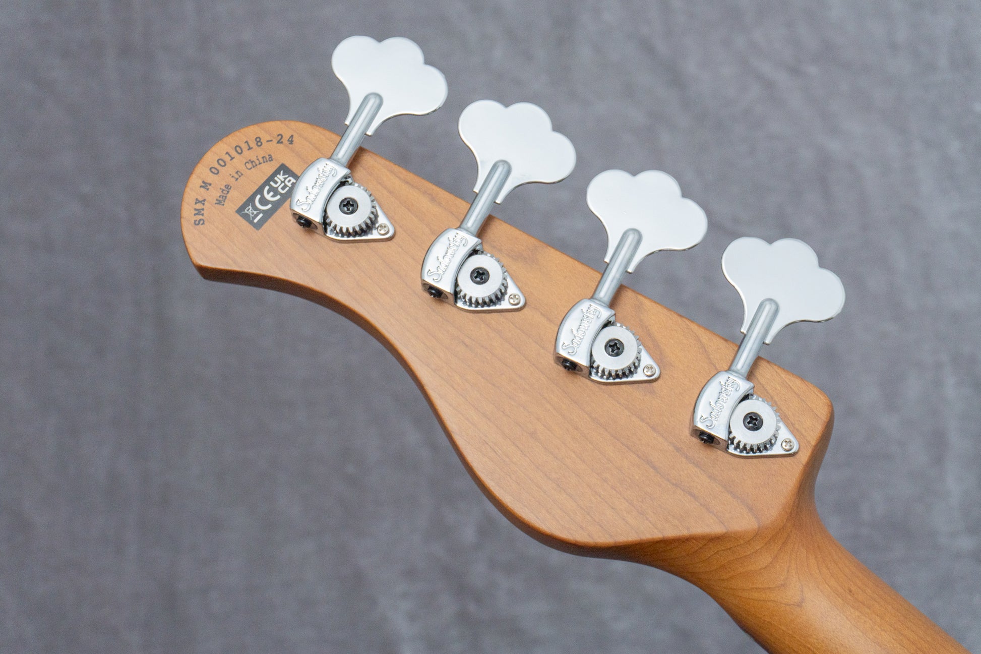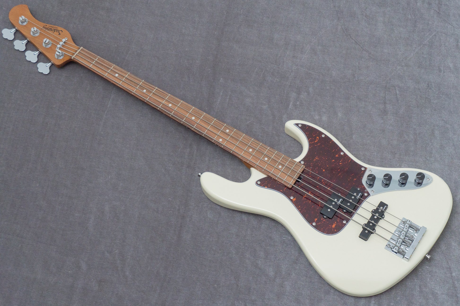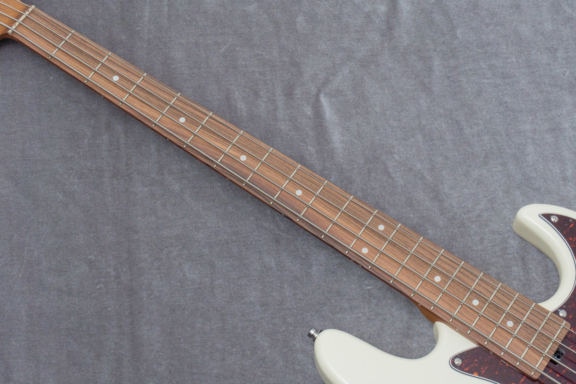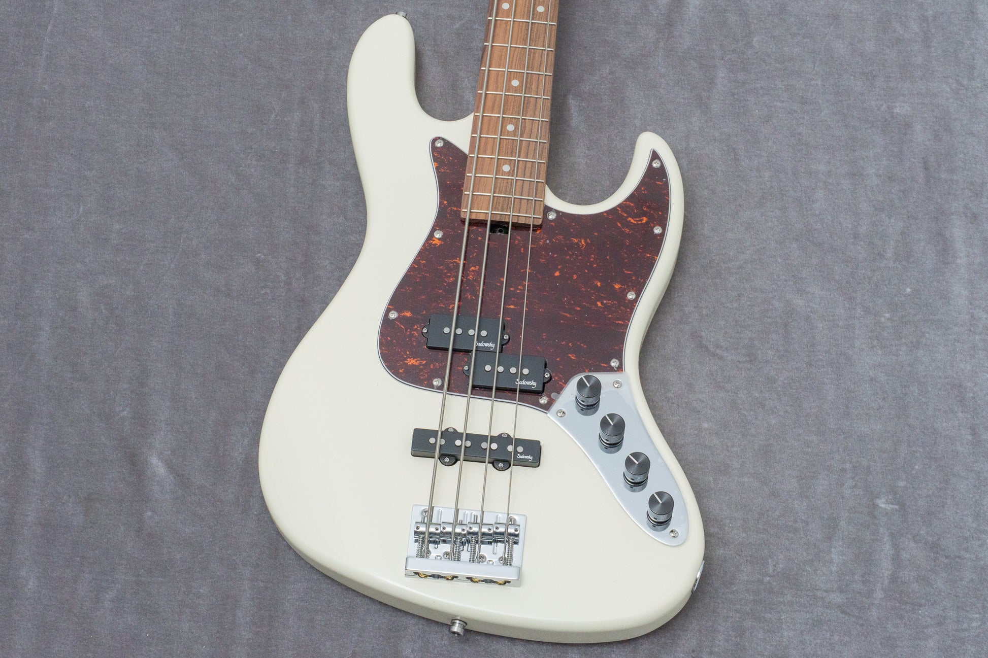 The pickup configuration is a PJ type: a Precision Bass-style pickup at the neck and a Jazz Bass-style pickup at the bridge.