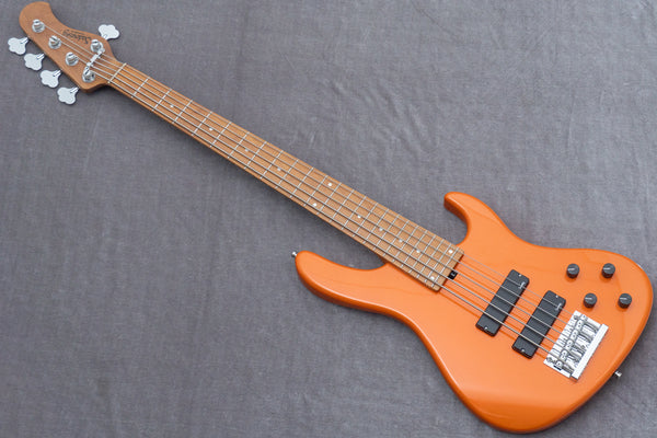 The body is made of Okoume and the neck and fingerboard are made of Roasted Maple.
