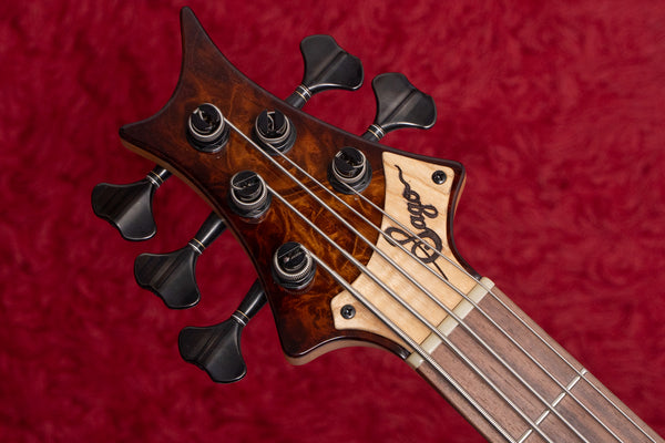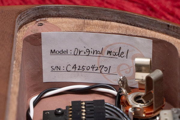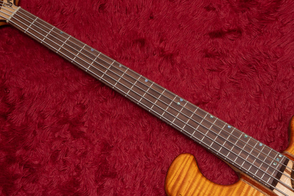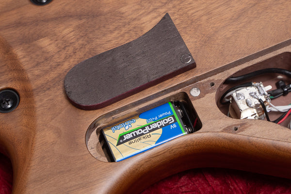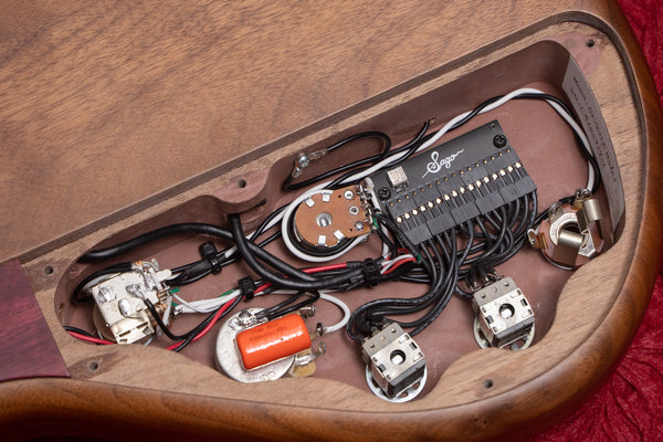 The body back is made of walnut, and the top is made of a complex construction using flame maple, walnut, Padauk, etc.