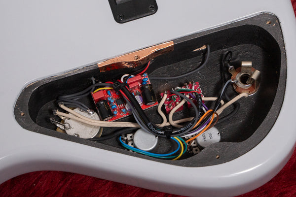 Controls are volume, treble, bass, and a PU wiring switch (series-tap-parallel) with an active/passive switch.