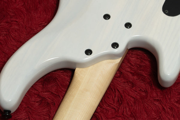 The body is ash, the fingerboard is blackwood, and the neck is maple, a 3P laminate type.