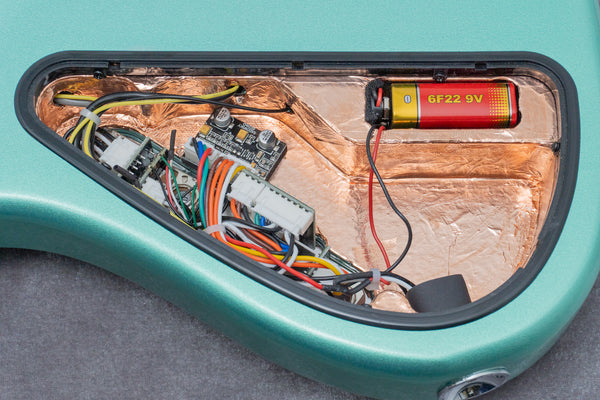 Looking inside the cavity, you'll see copper foil tape applied for shielding. Excellent.