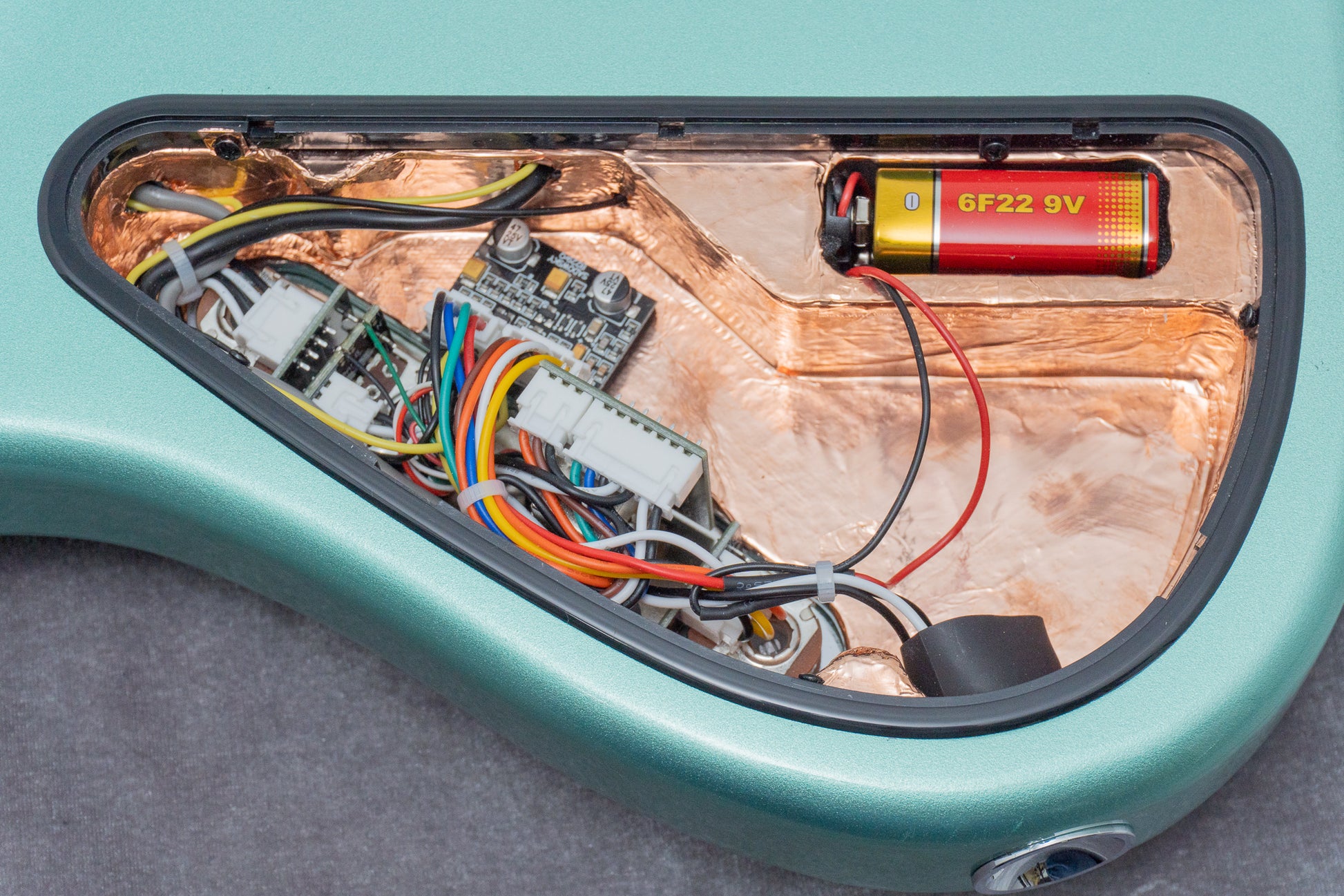 Looking inside the cavity, you'll see copper foil tape applied for shielding. Excellent.