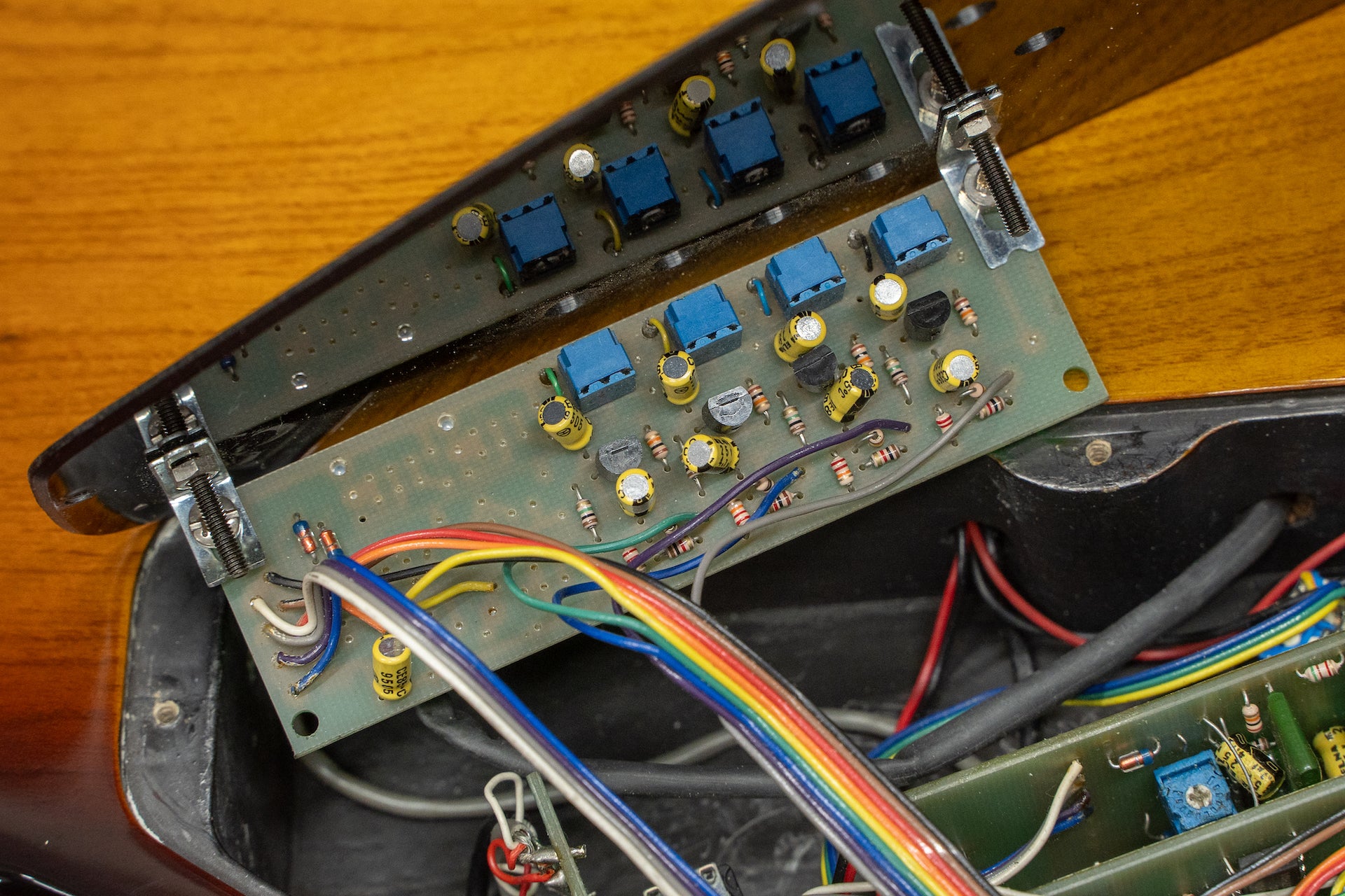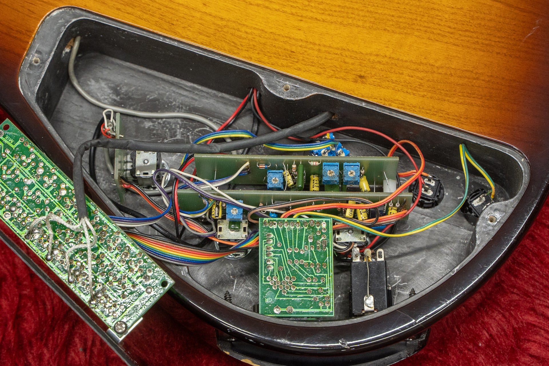 Controls : Master volume/Magnetic PU balancer, Synth volume/Magnetic PU bass equalizer, Piezo PU volume/Magnetic PU treble equalizer, PU selector (neck side magnetic, center side magnetic & piezo, Piezo on bridge side), 2 synth control switches