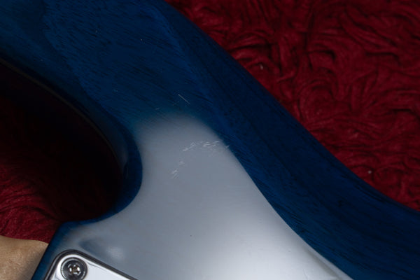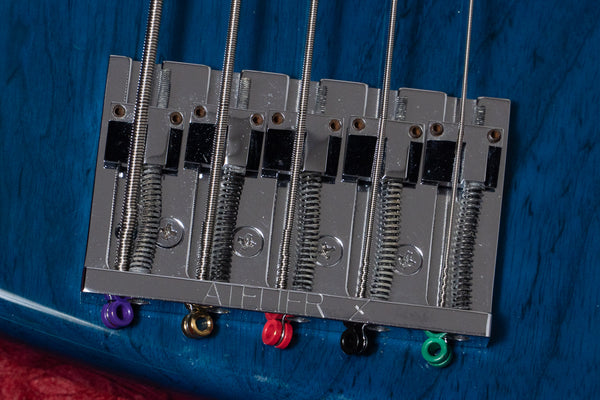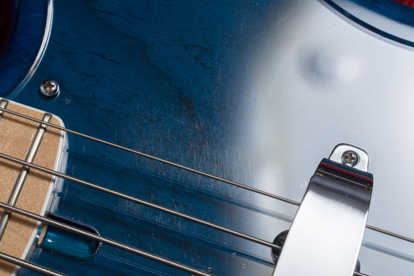 The strap pin has been replaced with a Schaller one. All knobs have been replaced. The treble and bass stack pots have been replaced. The preamp has been replaced with an Aguilar OBP-3.
