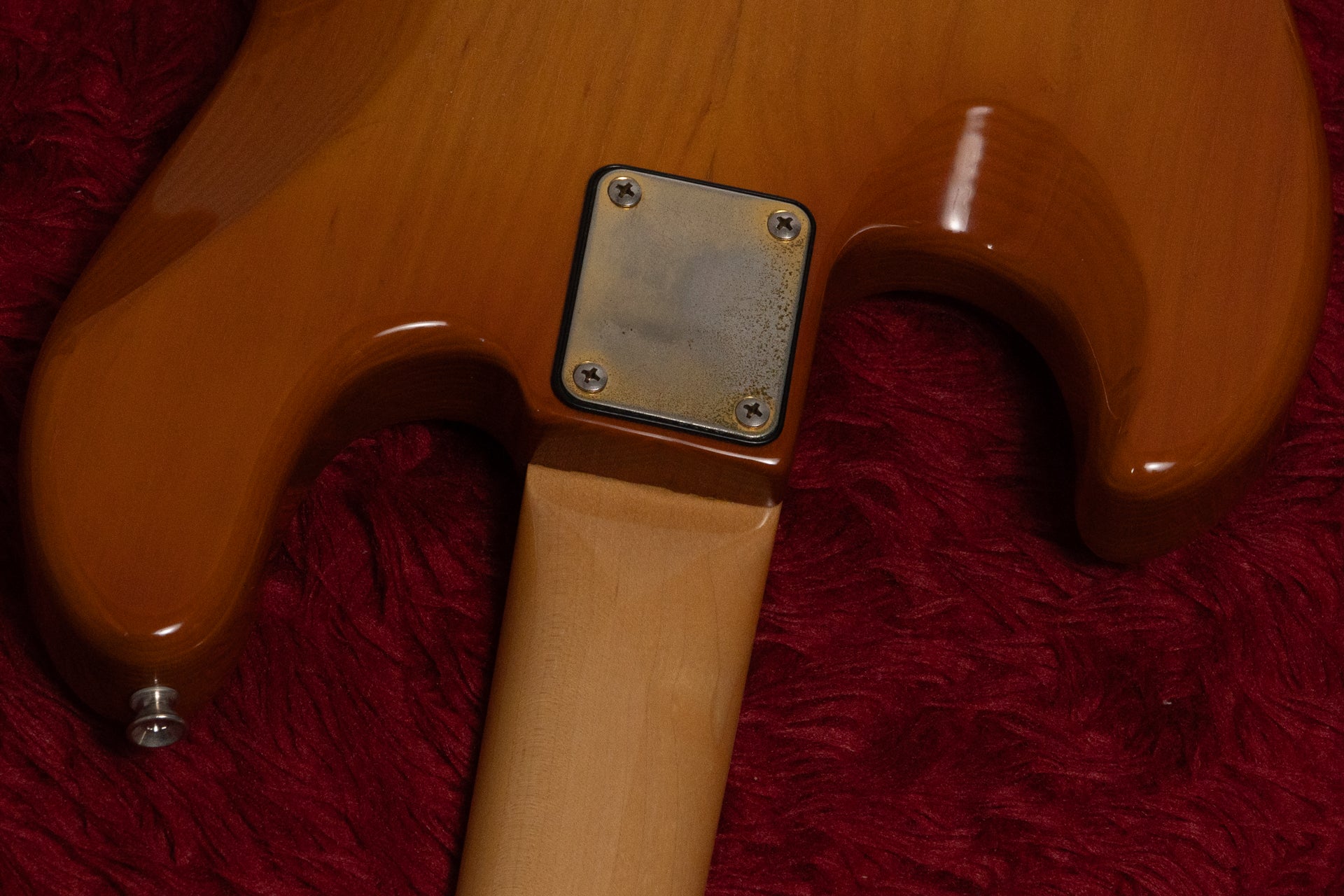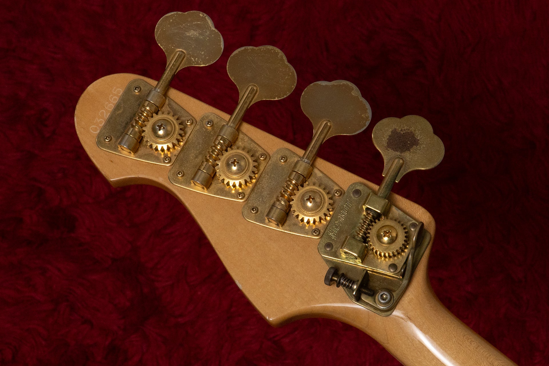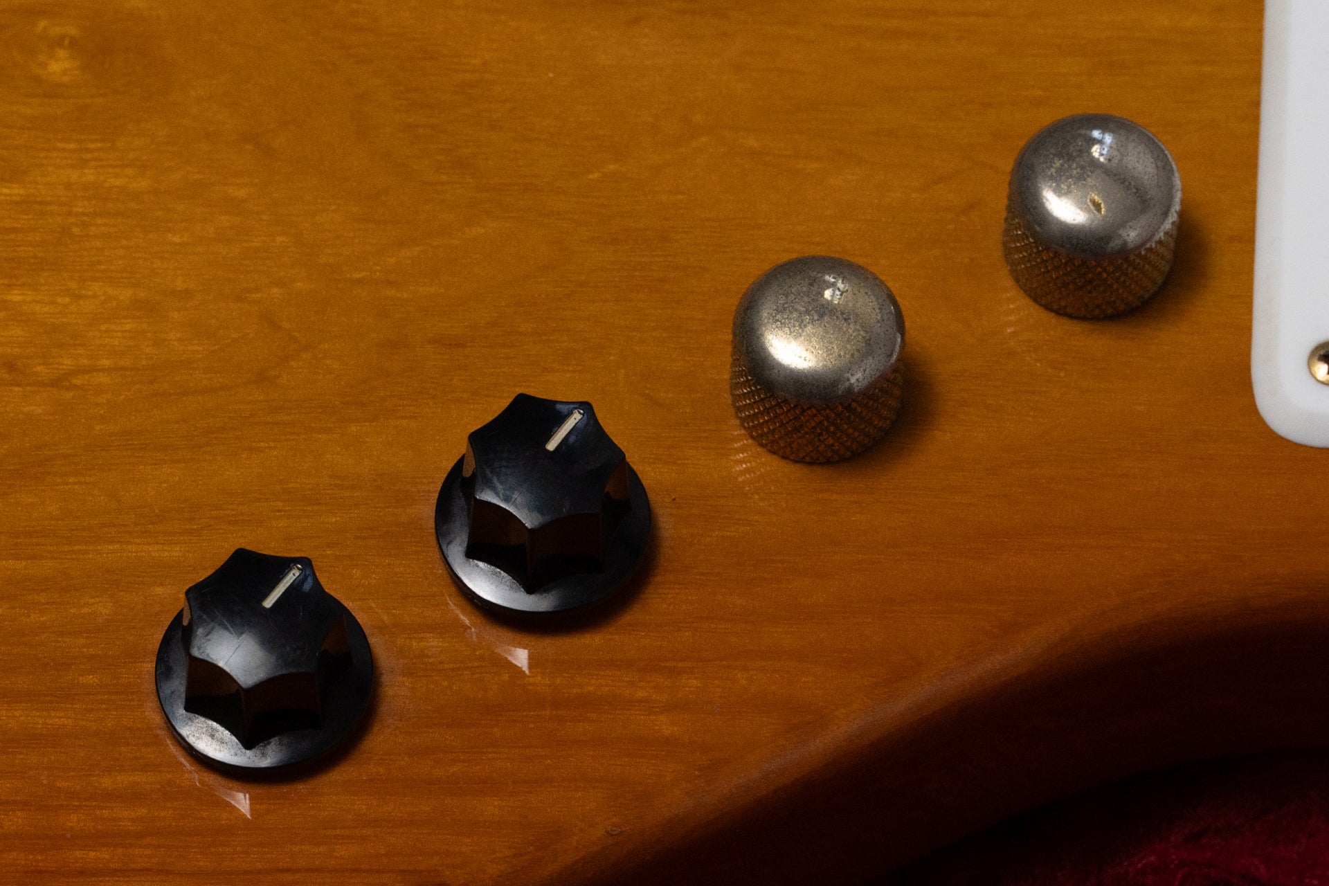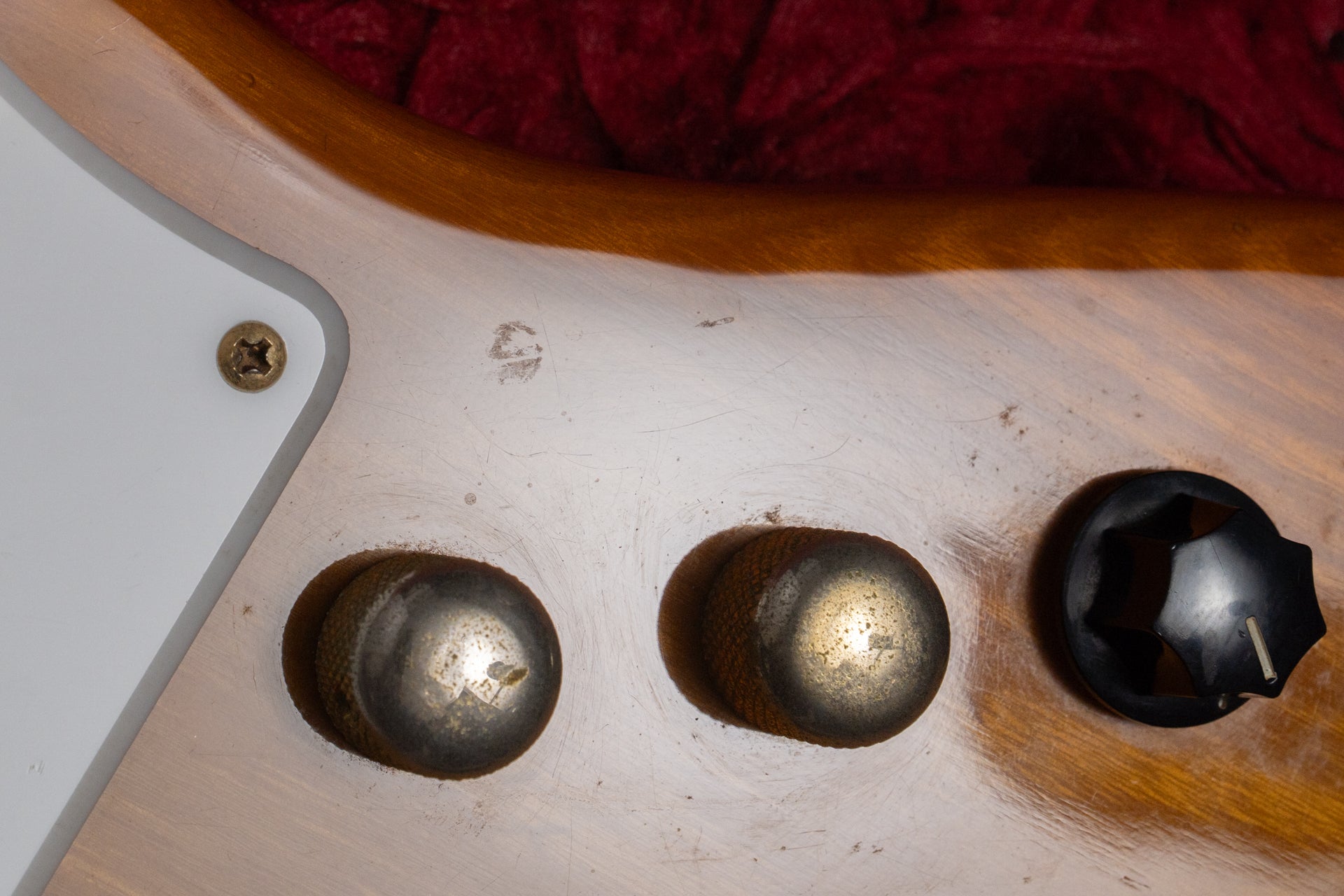 Controls: Neck pickup volume, bridge pickup volume, treble, bass, mid-cut (inside cavity)