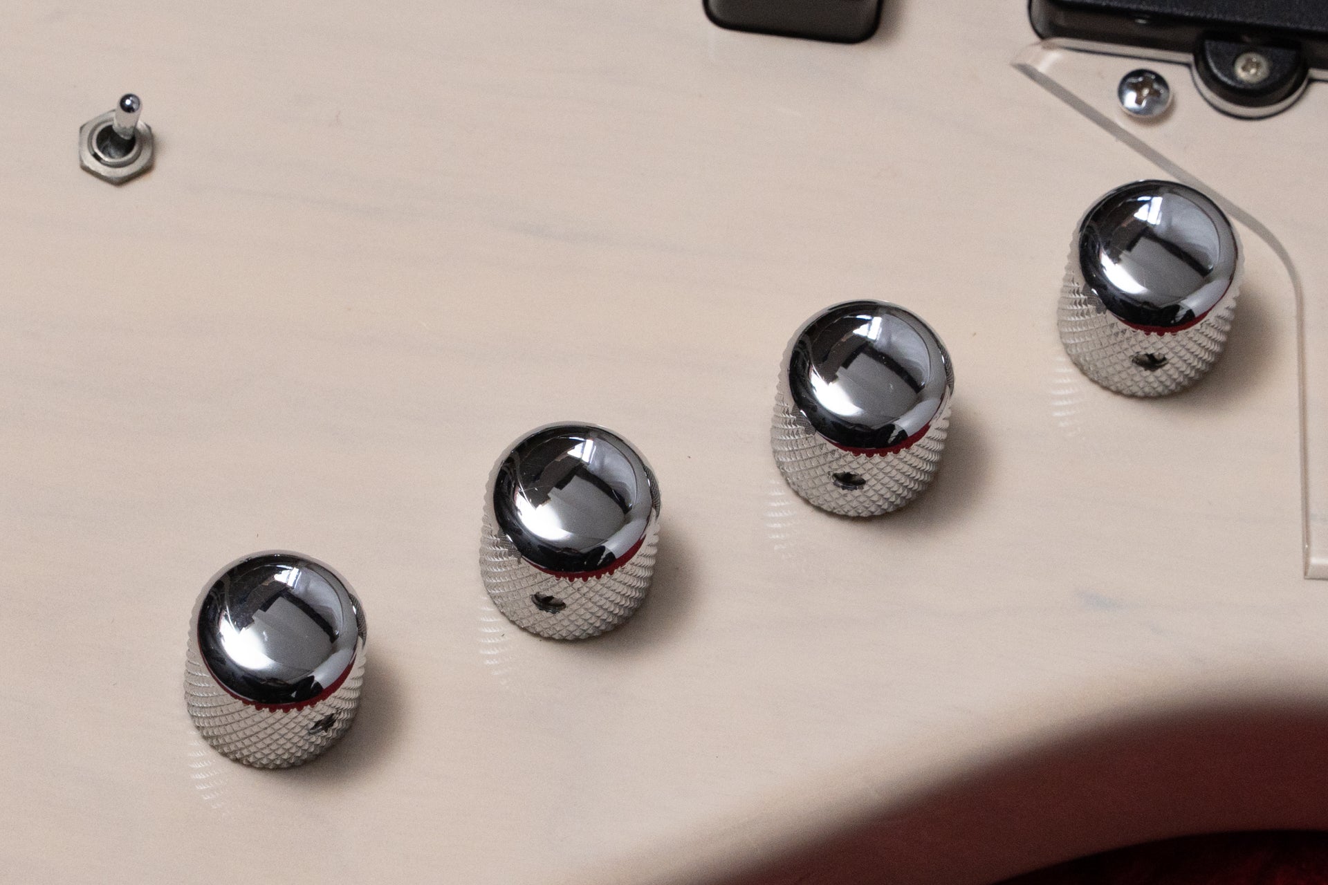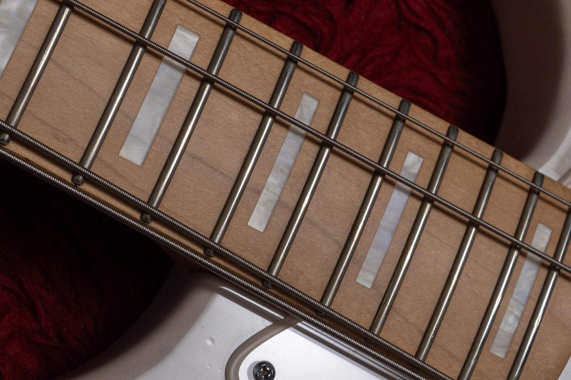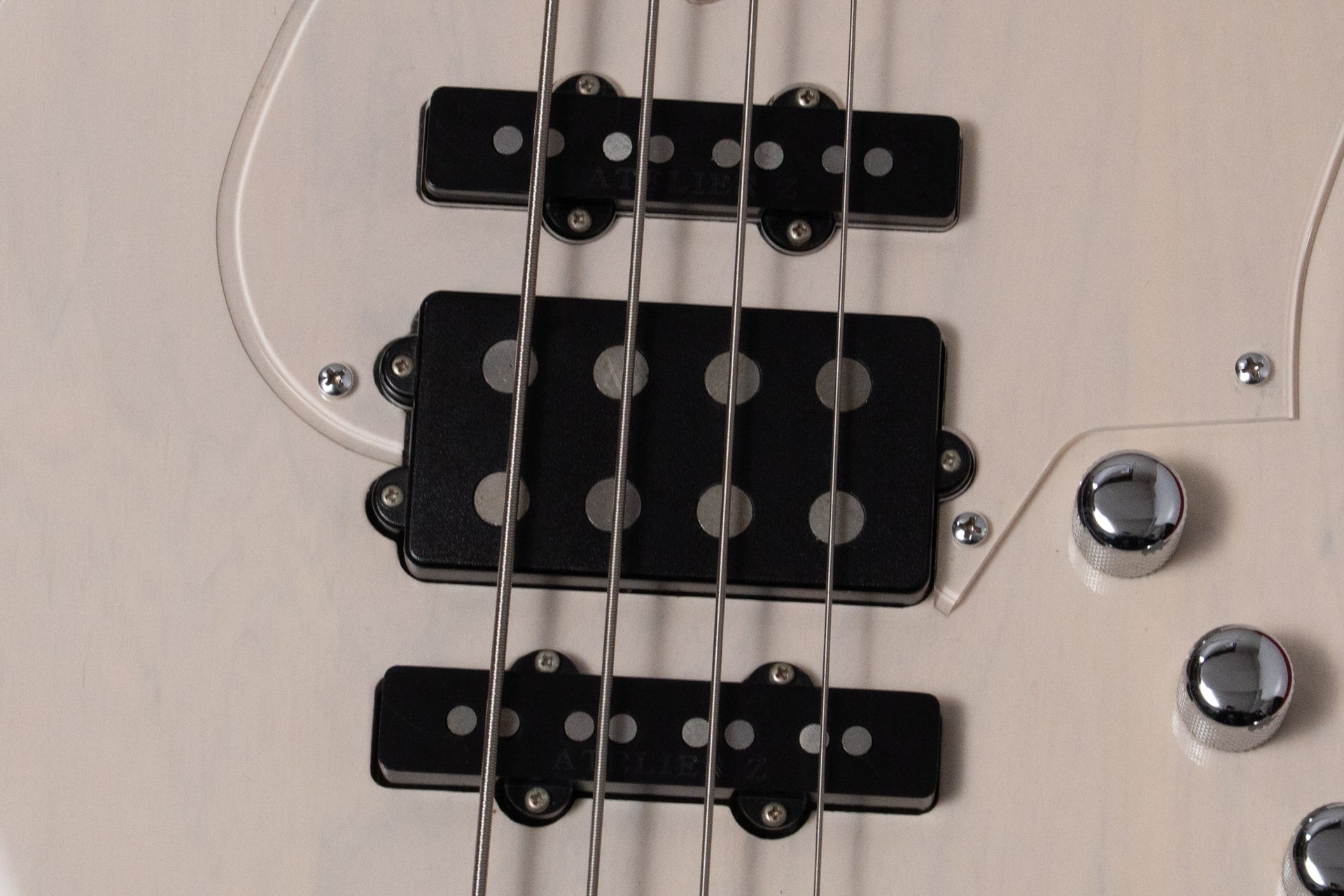 Controls: Neck pickup volume, bridge pickup volume, middle pickup volume, master tone, middle pickup on/off switch