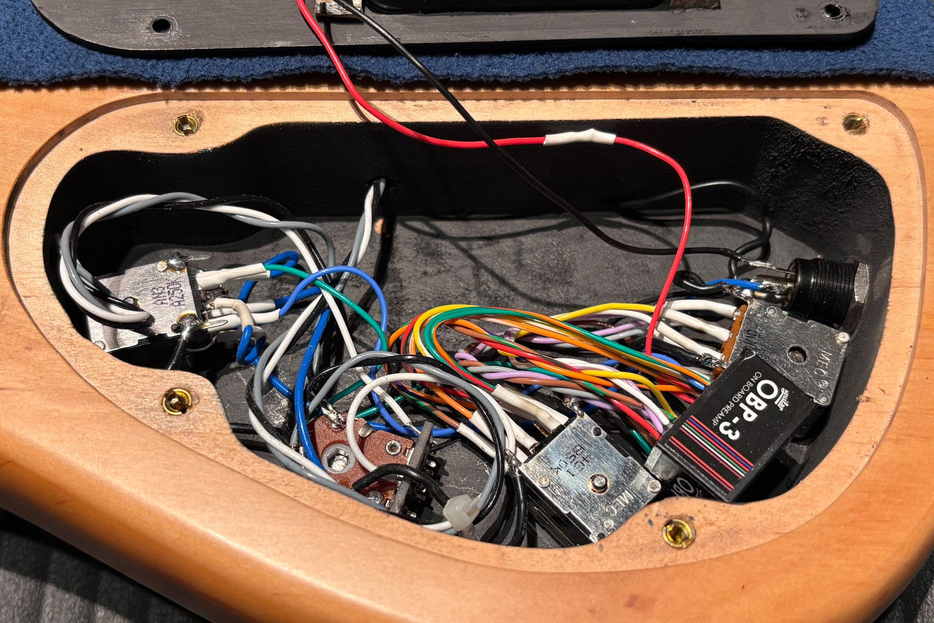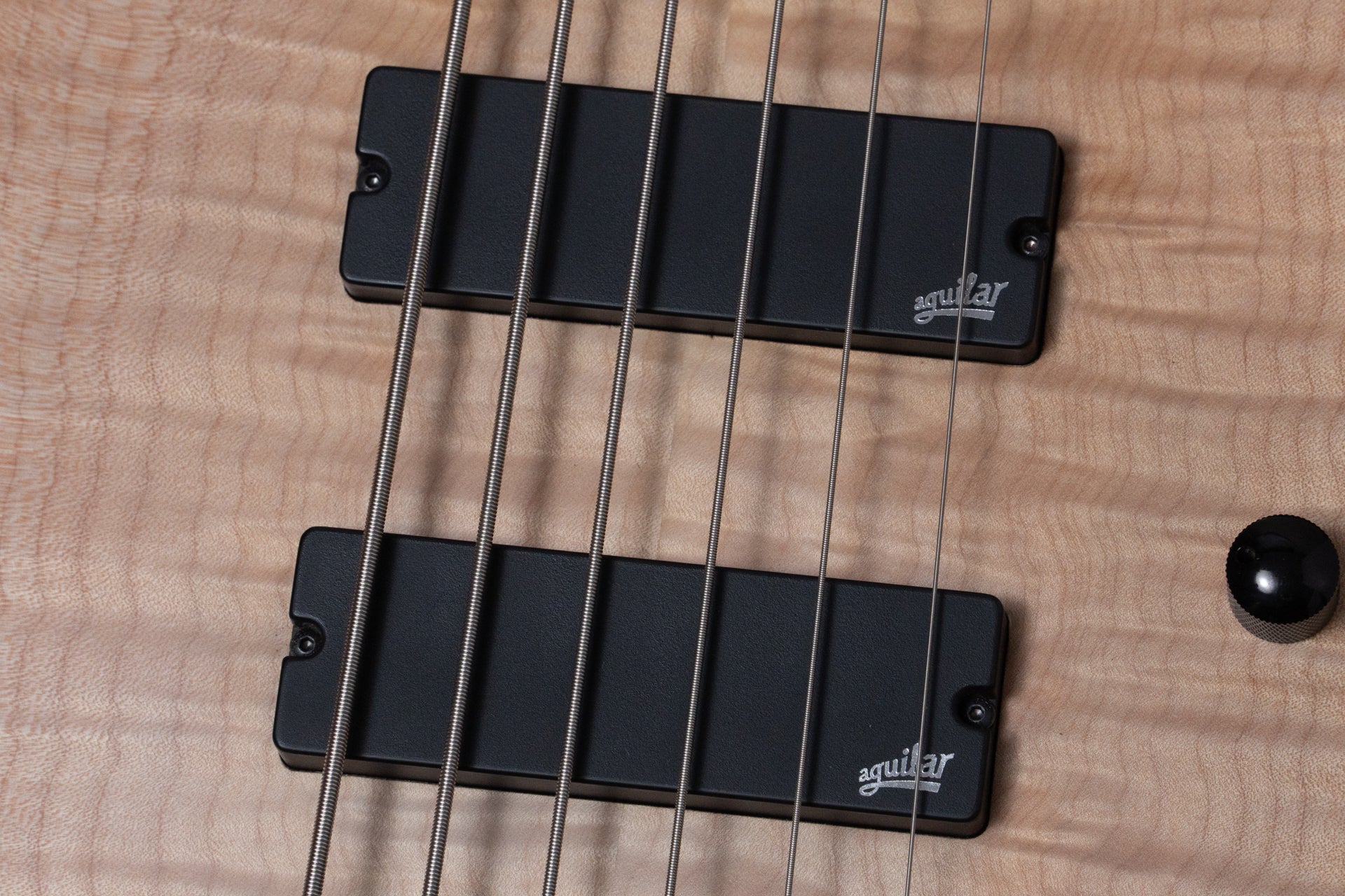 The pickups are Aguilar dual-coil types, and the preamp is also an Aguilar OBP-3.
