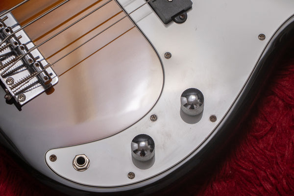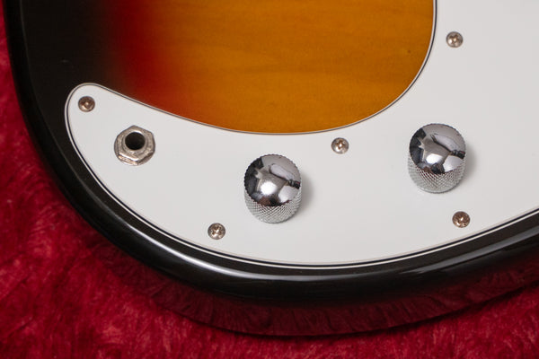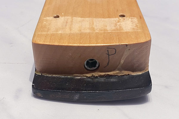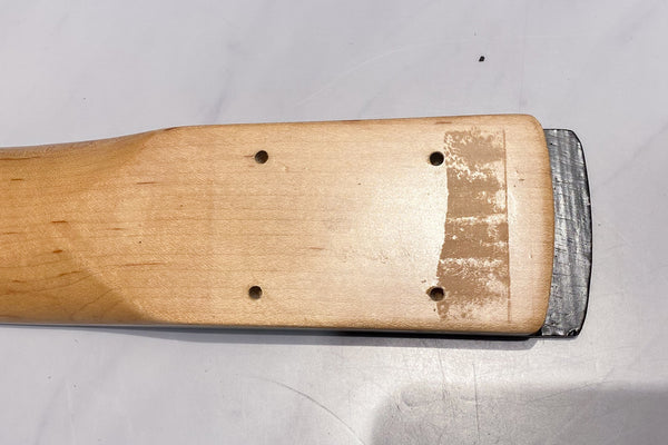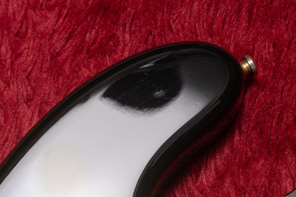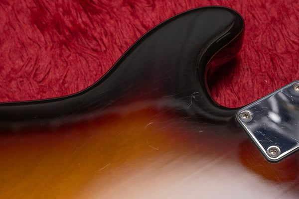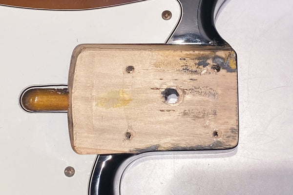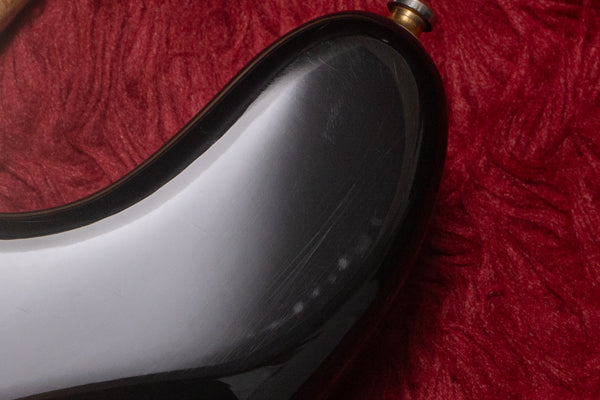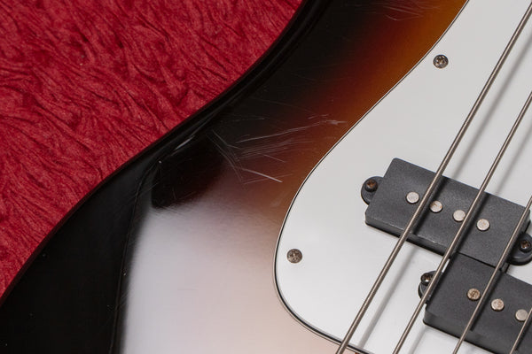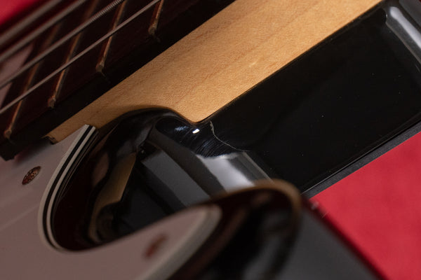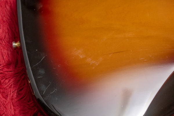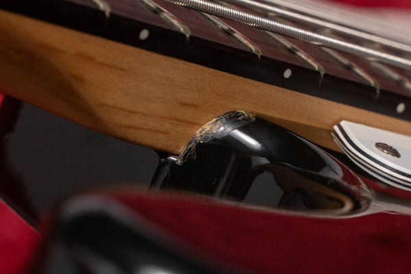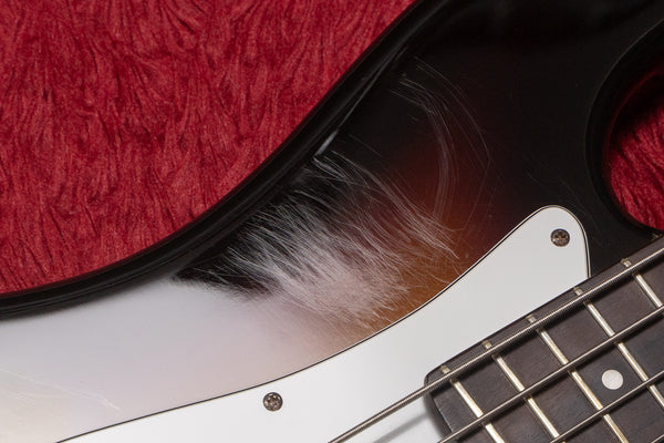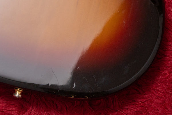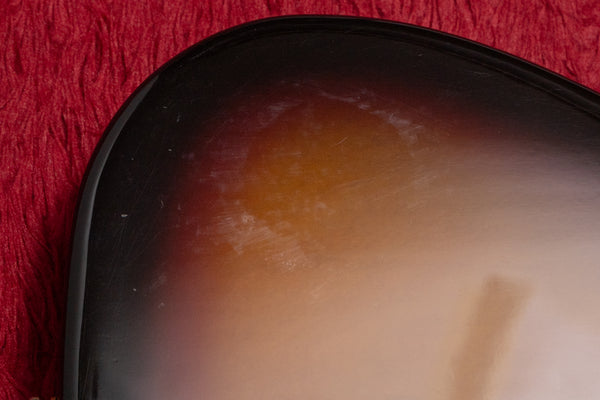 There are scratches on the body and finish. There are dents on the side of the body, showing signs of use.
