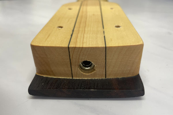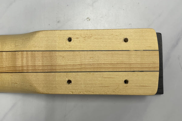 The neck is a maple and rosewood laminate.
