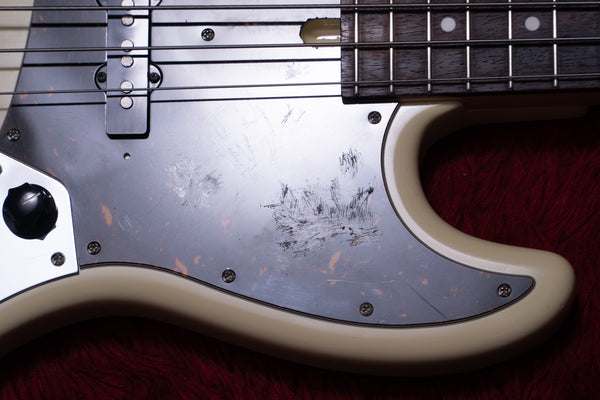 The body and finish show scattered dents and scratches. The pickguard has noticeable scratches.