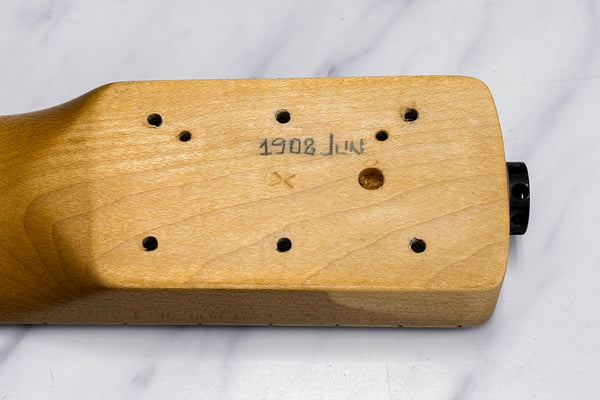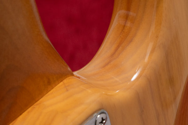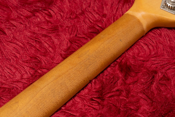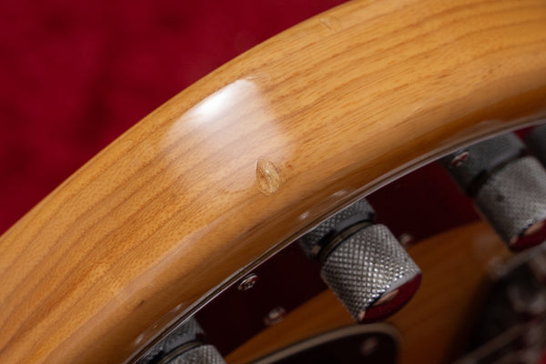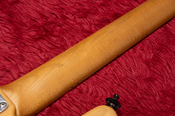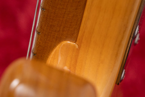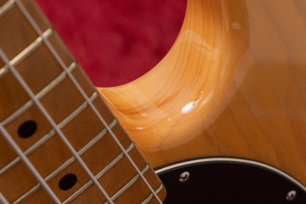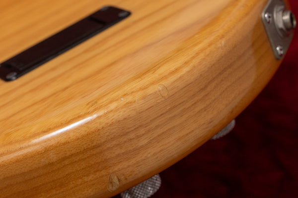 The body is made of ash and the fingerboard is maple, typical of a Stingray.
