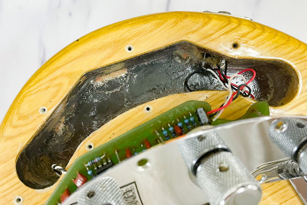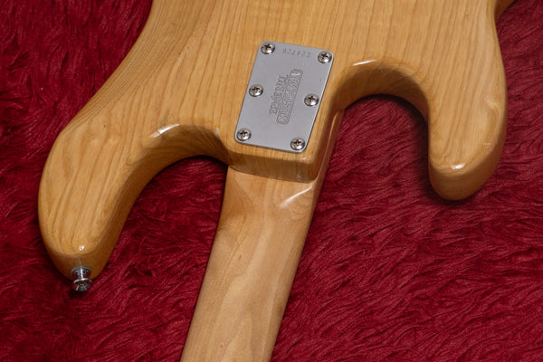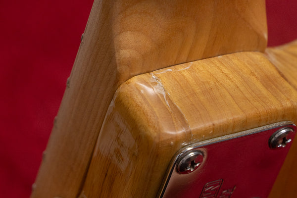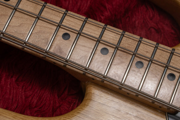The body is made of ash and the fingerboard is maple, typical of a Stingray.