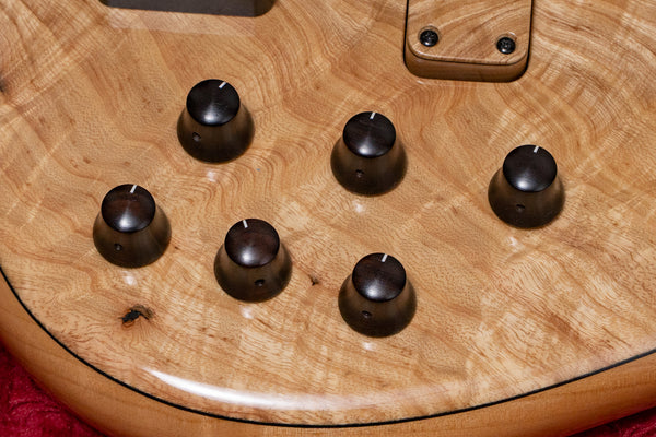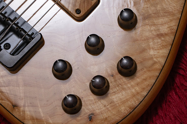 Controls: Neck pickup volume, bridge pickup volume (pull - hum-canceling open/close), master tone (push/pull - active/passive), bass, middle, treble