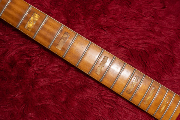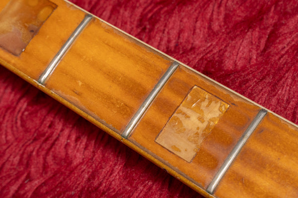 The neck is in good condition. The center of the first-fret inlay appears to be slightly raised and cracked, suggesting that the truss rod may be pushing up on the fingerboard. The finish on the neck grip is cracked and chipped.
