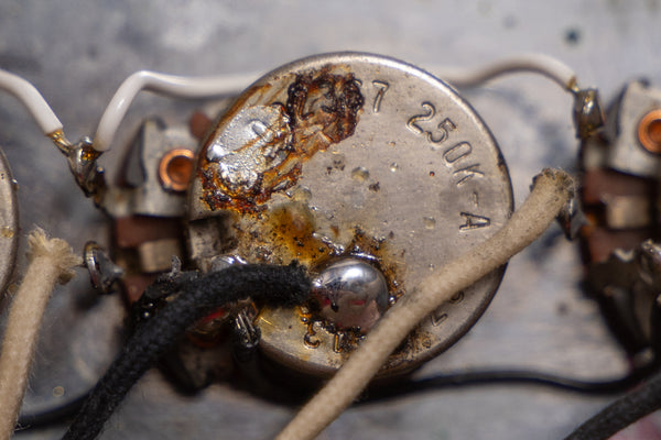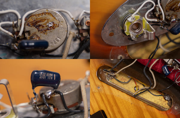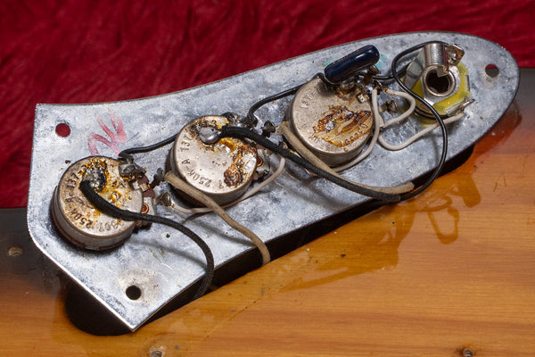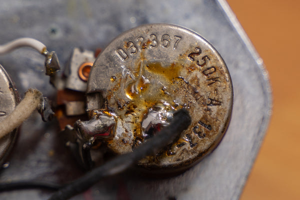The neck and body are from different eras. Although it currently has three fastenings, there are traces of a four-fastening on the neck. There are no date indications on the neck end or neck pocket. The nut appears to have been replaced. The back of the PG is shielded with silver foil. The pickups have been replaced with Vanzandt pickups. The jack has been replaced with a China-made one. The wiring has also been replaced. The strap pins have been replaced with Schaller-made ones.
