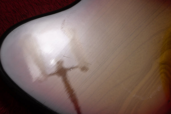 The body is made of ash and the fingerboard is made of rosewood, a classic construction.