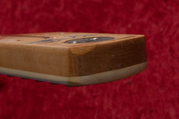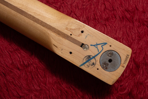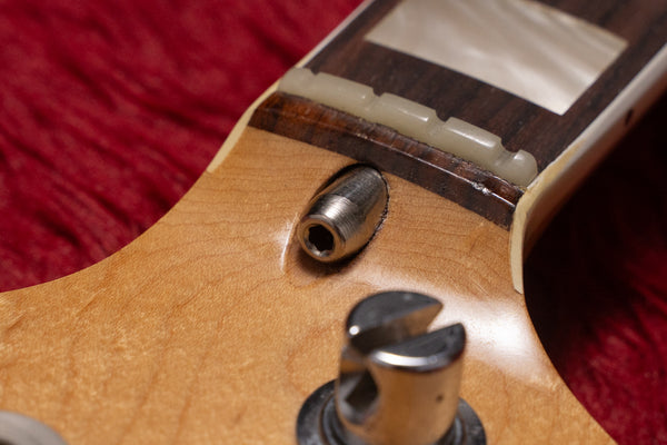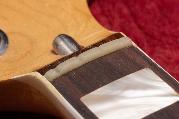 The guitar has been refretted, and the nut replaced accordingly. It feels smooth to play, and the work was done with great precision.