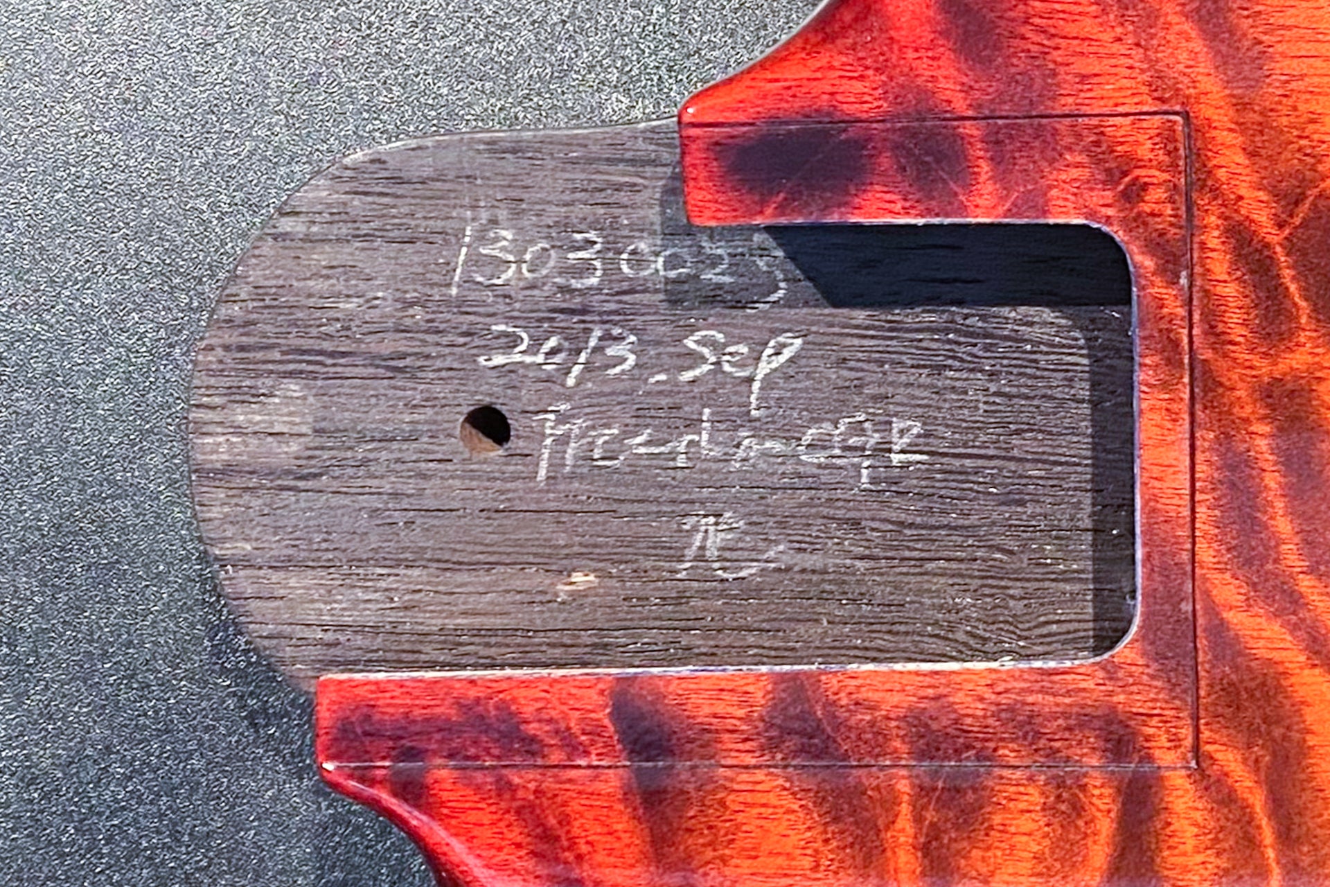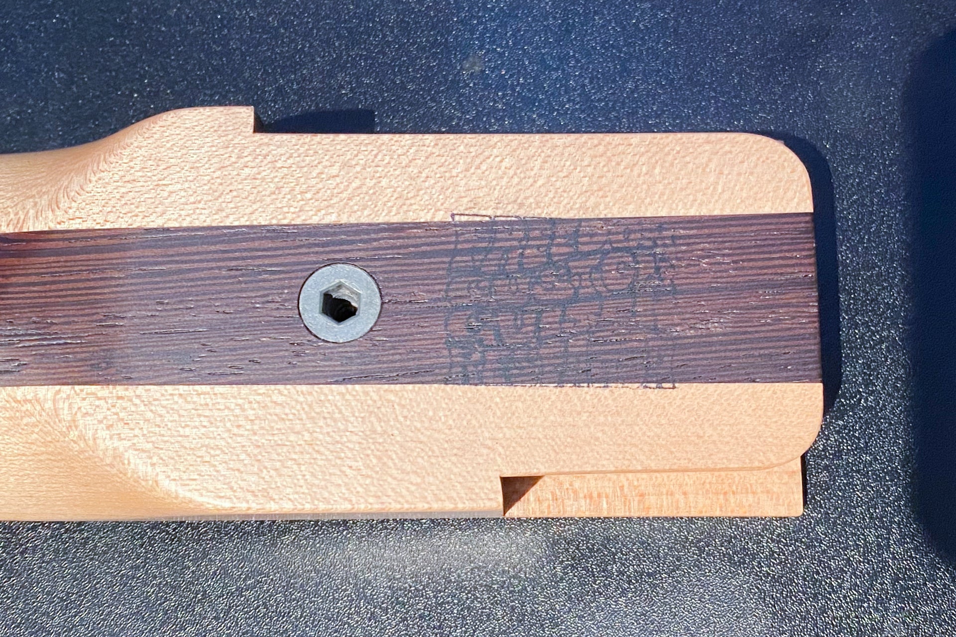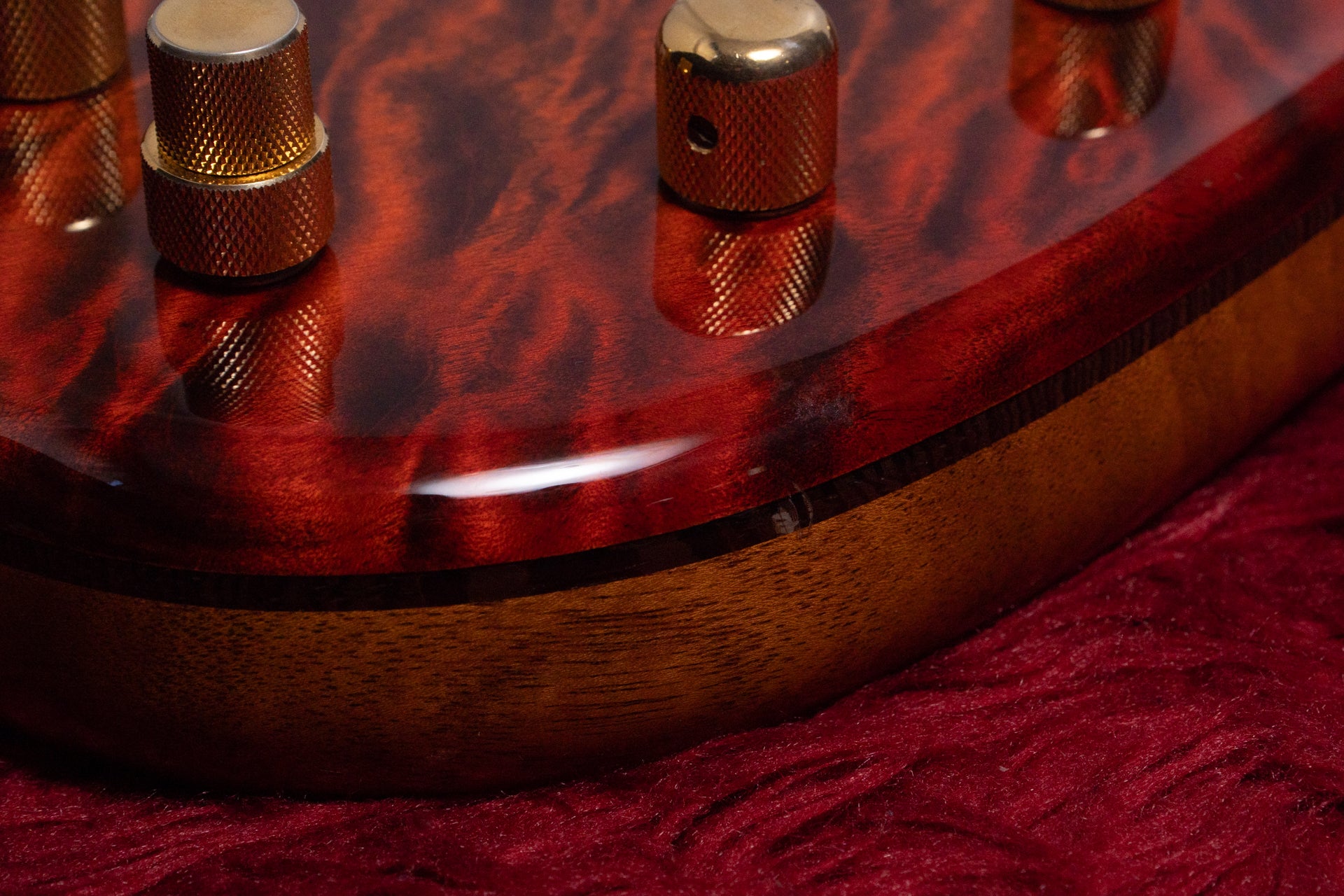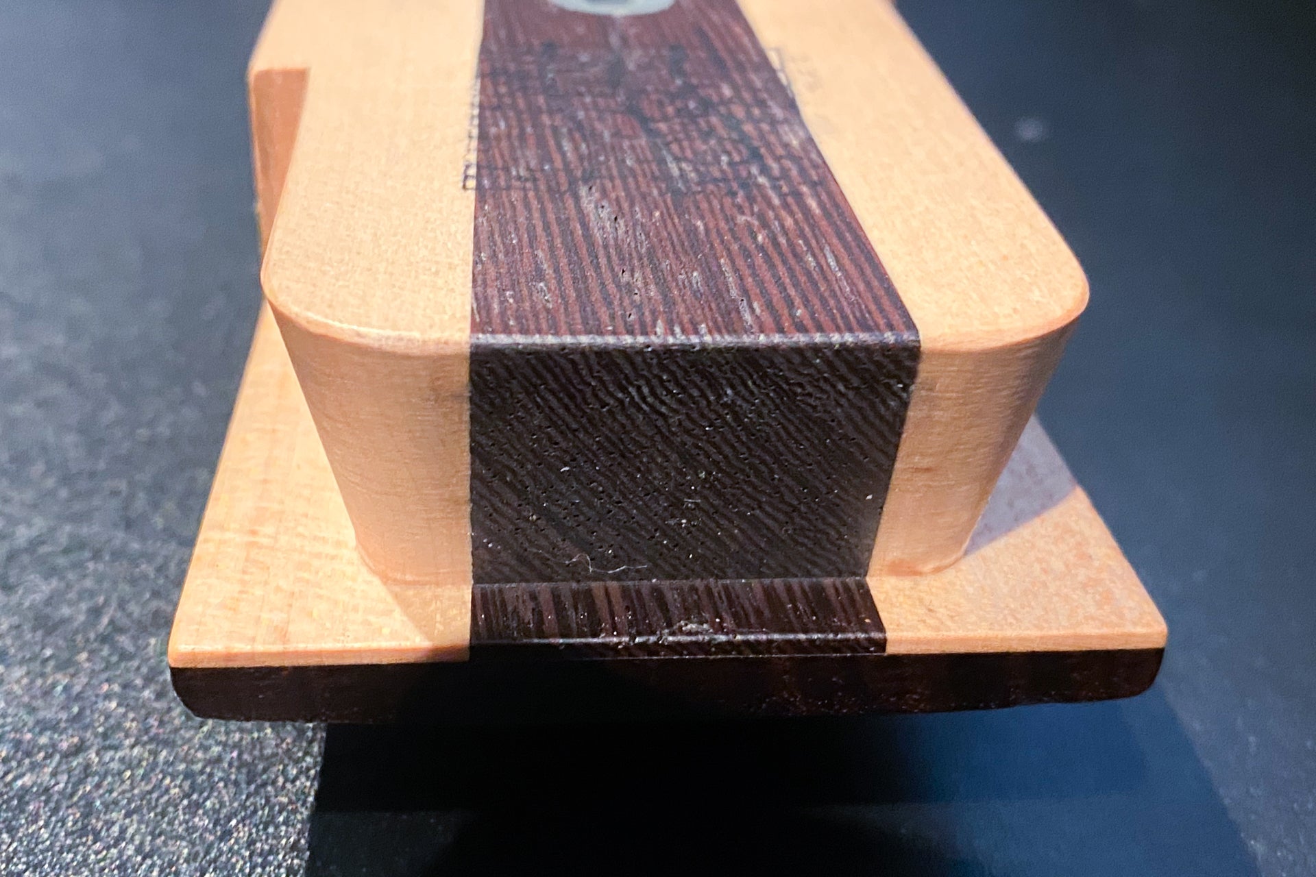 The body top is a figured maple and wenge laminate.