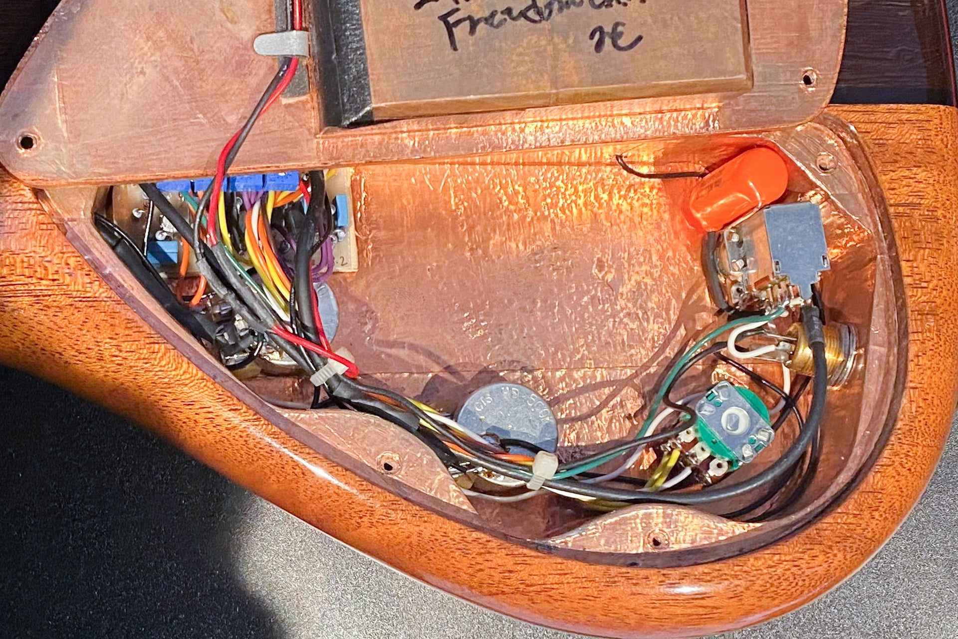 Controls: Neck pickup volume, bridge pickup volume, treble/mid, master tone (push/pull - active/passive), cavity (mid gain, mid frequency, bass frequency, preamp gain)