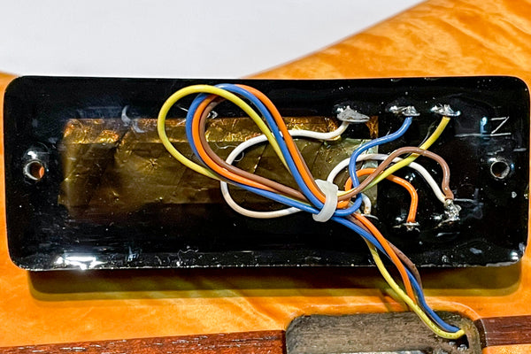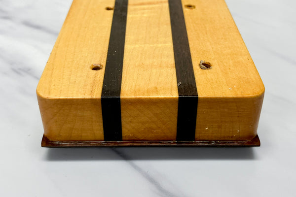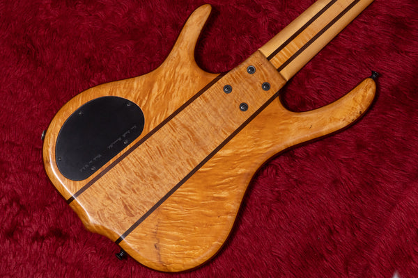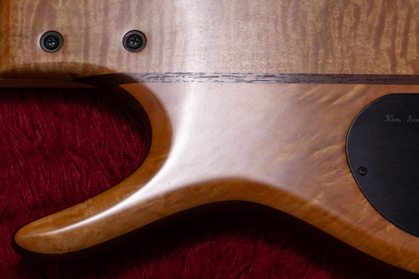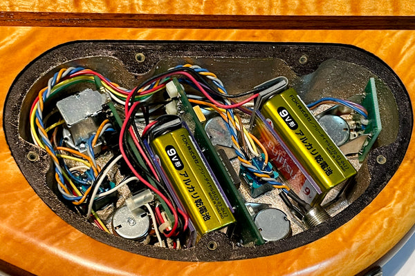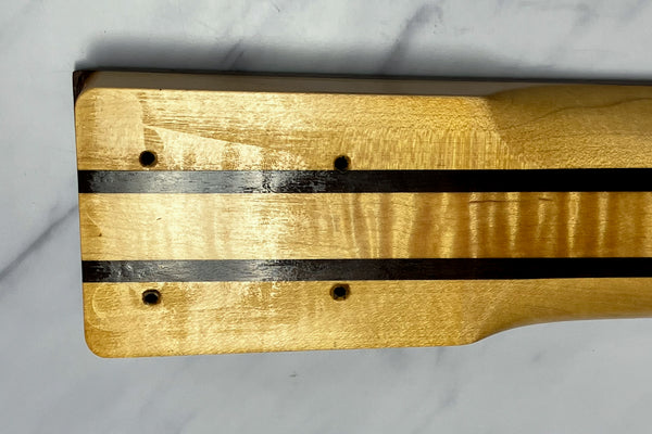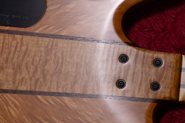 The top and back of the body wings are made of 4A Wild Figured Tiger Maple, and the core is made of Virginia Walnut.