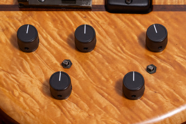 Controls: Master volume (push-pull/active-passive), balancer, treble, middle, bass, neck PU series/tap/parallel switch, bridge PU series/tap/parallel switch