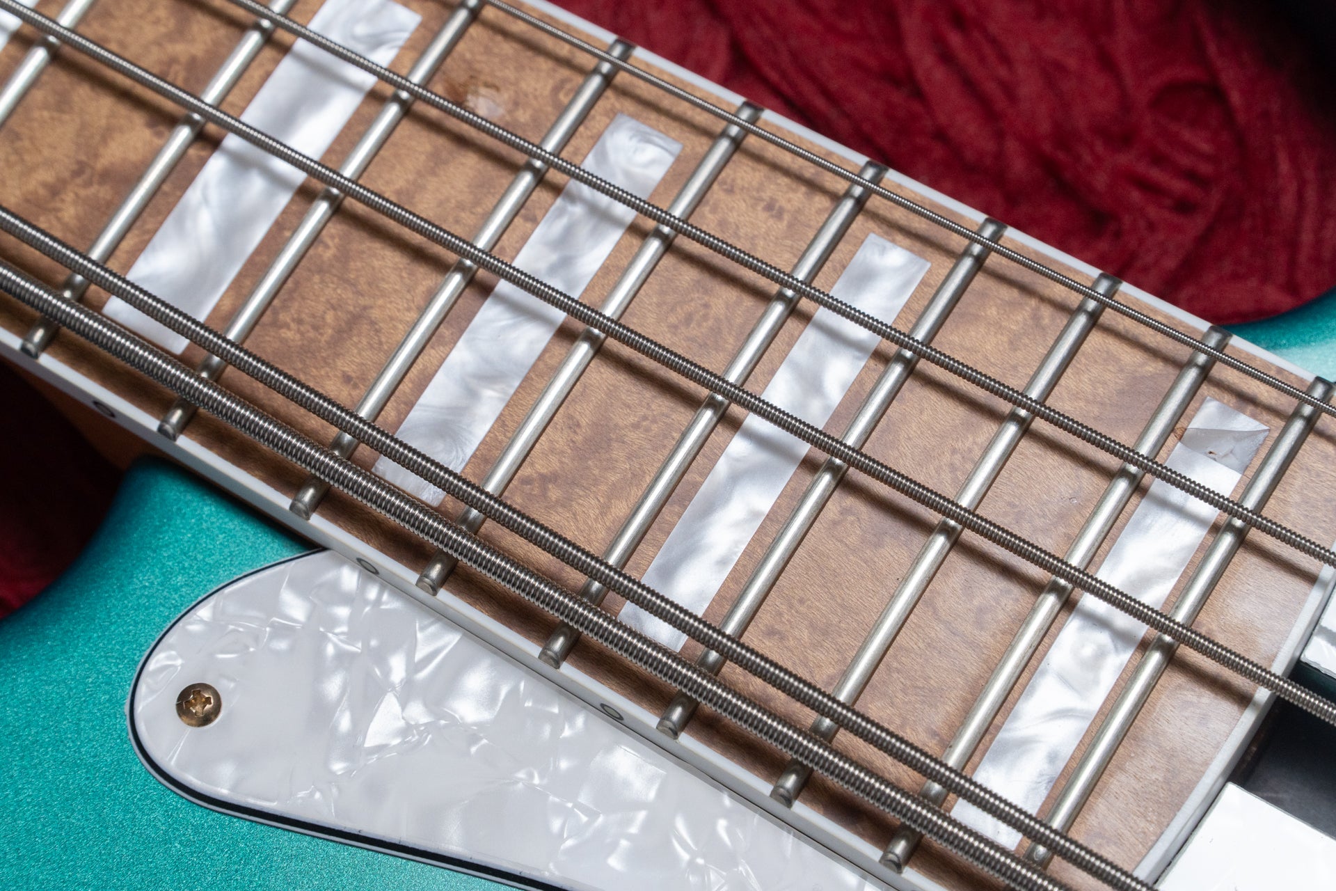 The body is a Sassafras, the neck is maple, and the fingerboard is Birdseye Maple.