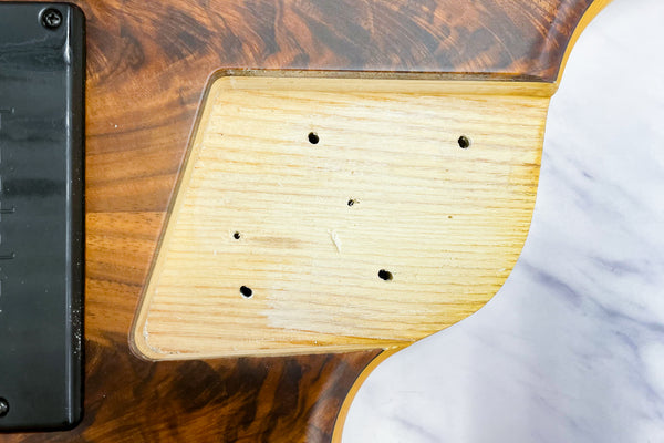 There are minor scratches on the body and paint. The neck pickup shows signs of use, as if it had been damaged by the strings.