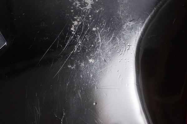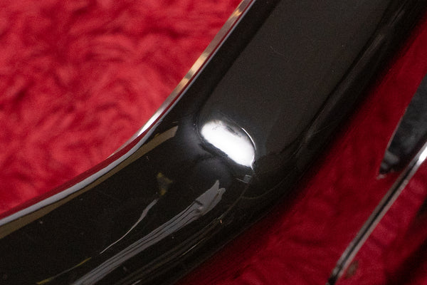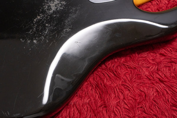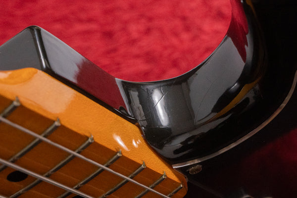 The body and finish show signs of use, with dents and scratches. The pickguard has a crack that appears to have been caused by the screws being driven in. It's also missing a small section.