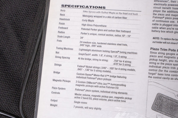 Controls: Master Volume, Magnetic Pickup Volume, Magnetic Pickup Balancer (No Center Detent), Treble/Bass (No Center Detent), Piezo Pickup Volume/Piezo Pickup Tone