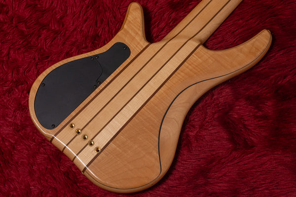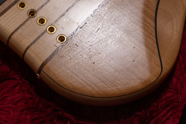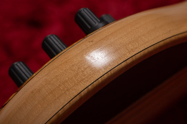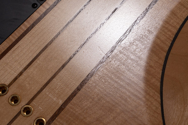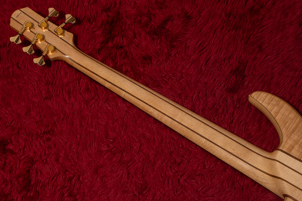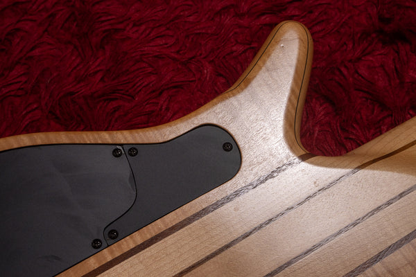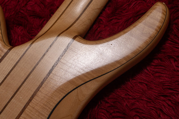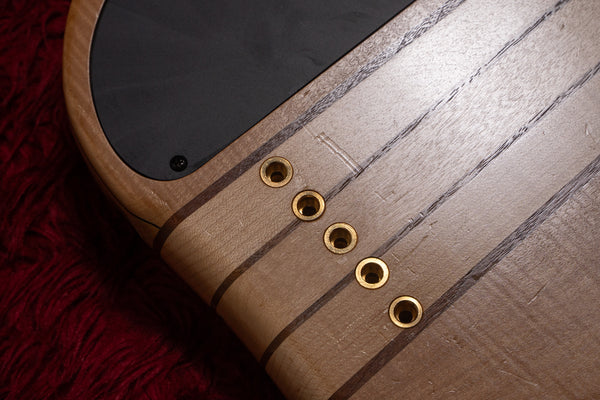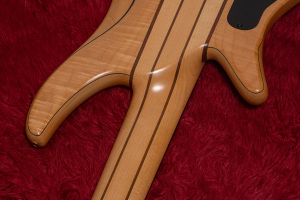 The laminated neck with a maple core is assembled in a neck-through construction.