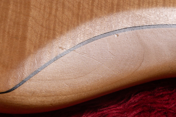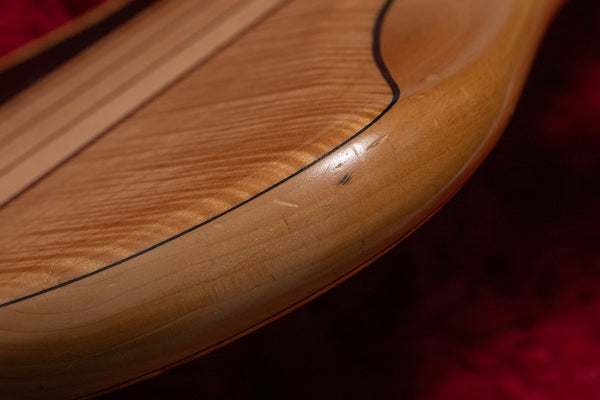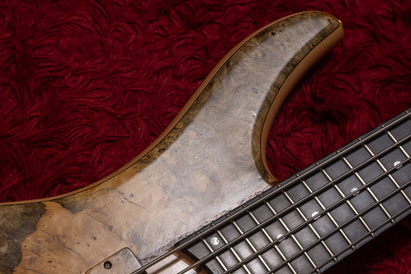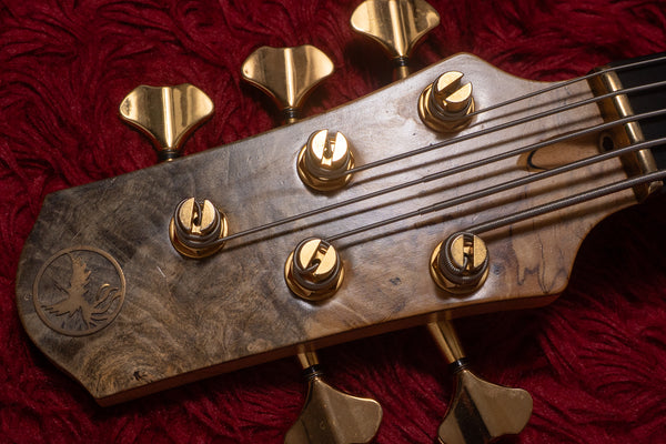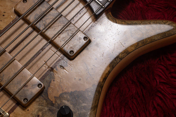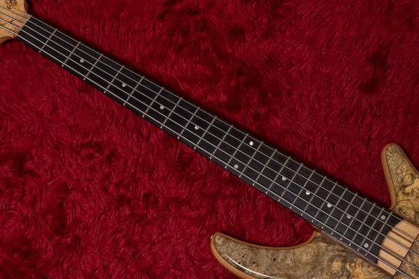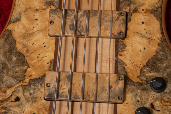 The body features a luxurious construction: a Buckeye Burl top, an Alder core, and a Flame Maple back.