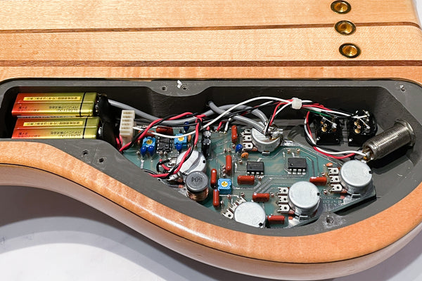 In addition to the 3-band EQ, gain settings for the neck and bridge pickups can be adjusted within the cavity, as well as a notch filter.