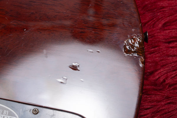 There are minor scratches on the body and finish. There is a large dent on the back.