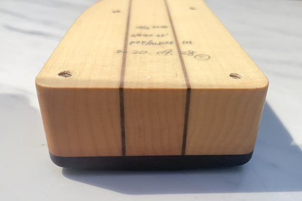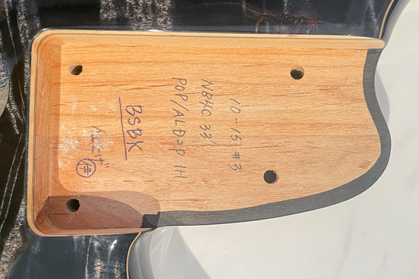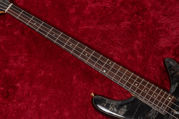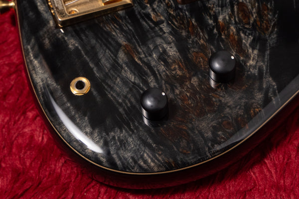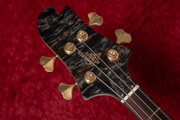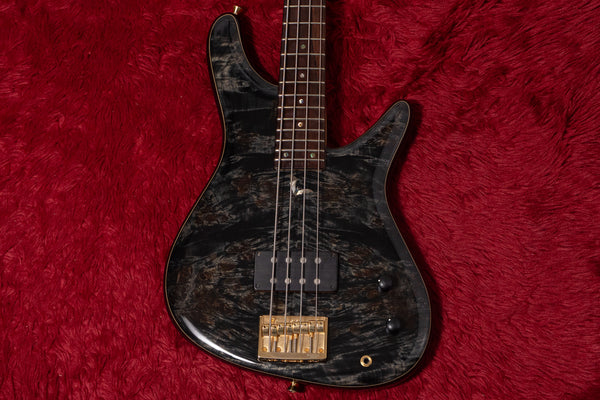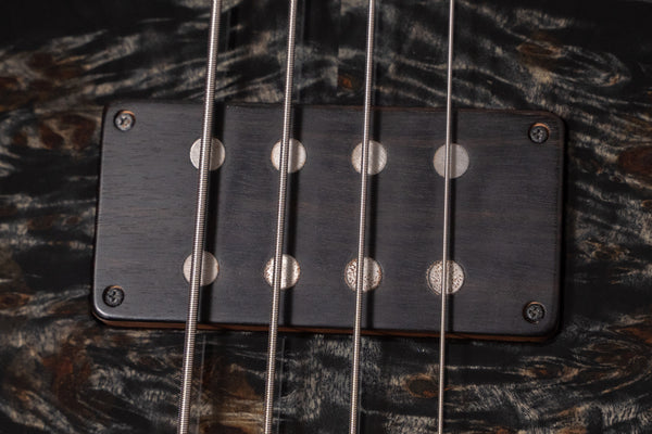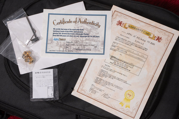 The neck is a laminate type with an Aqua Timber maple core, and the fingerboard is cocobolo.