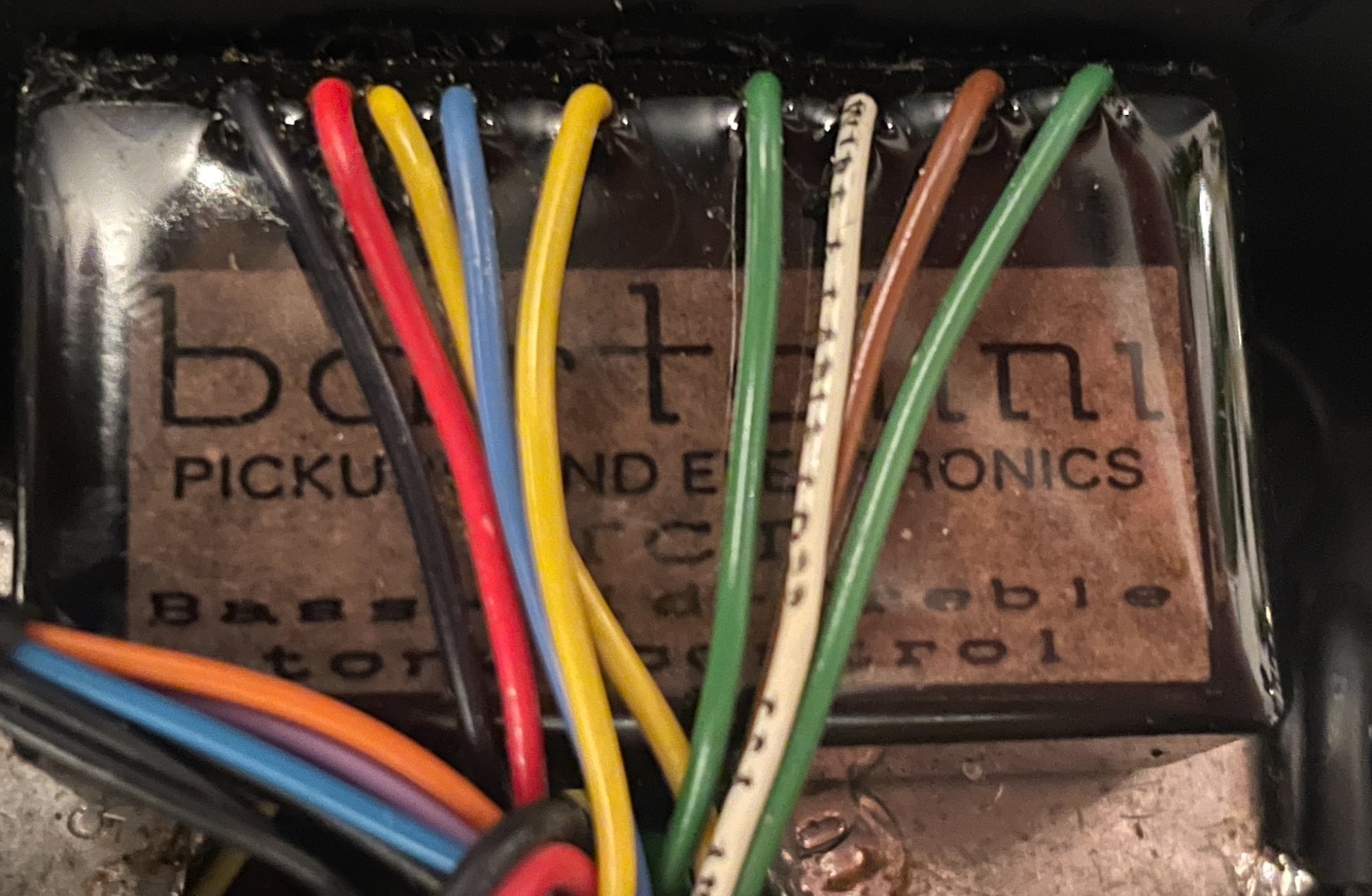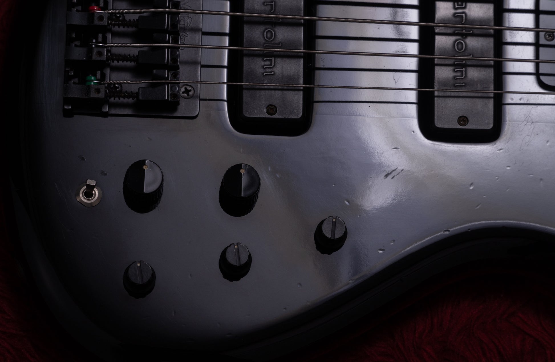 Controls: Neck pickup volume, bridge pickup volume, treble, middle, bass, active/passive switch