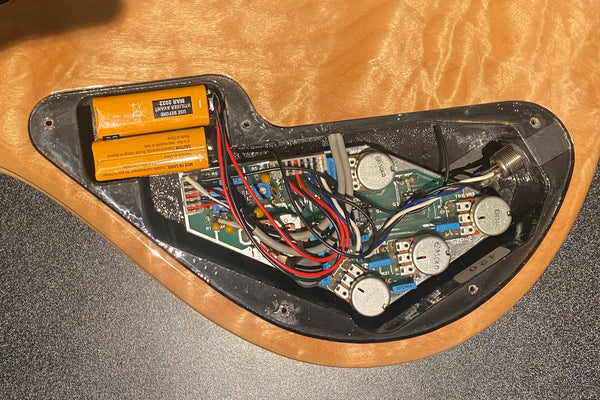 Controls: Master volume, balancer, bass, middle, treble, cavity (neck pickup gain, bridge pickup gain, notch filter)