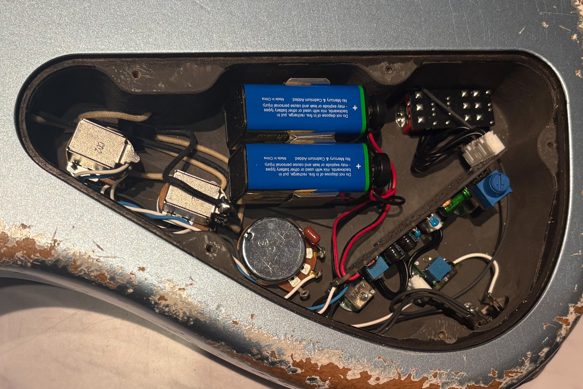 Controls: Neck pickup volume (push/pull - active/passive), bridge pickup volume (push/pull - series/parallel), master tone, bass, middle, treble, middle frequency switch, treble frequency switch, preamp gain (inside cavity)