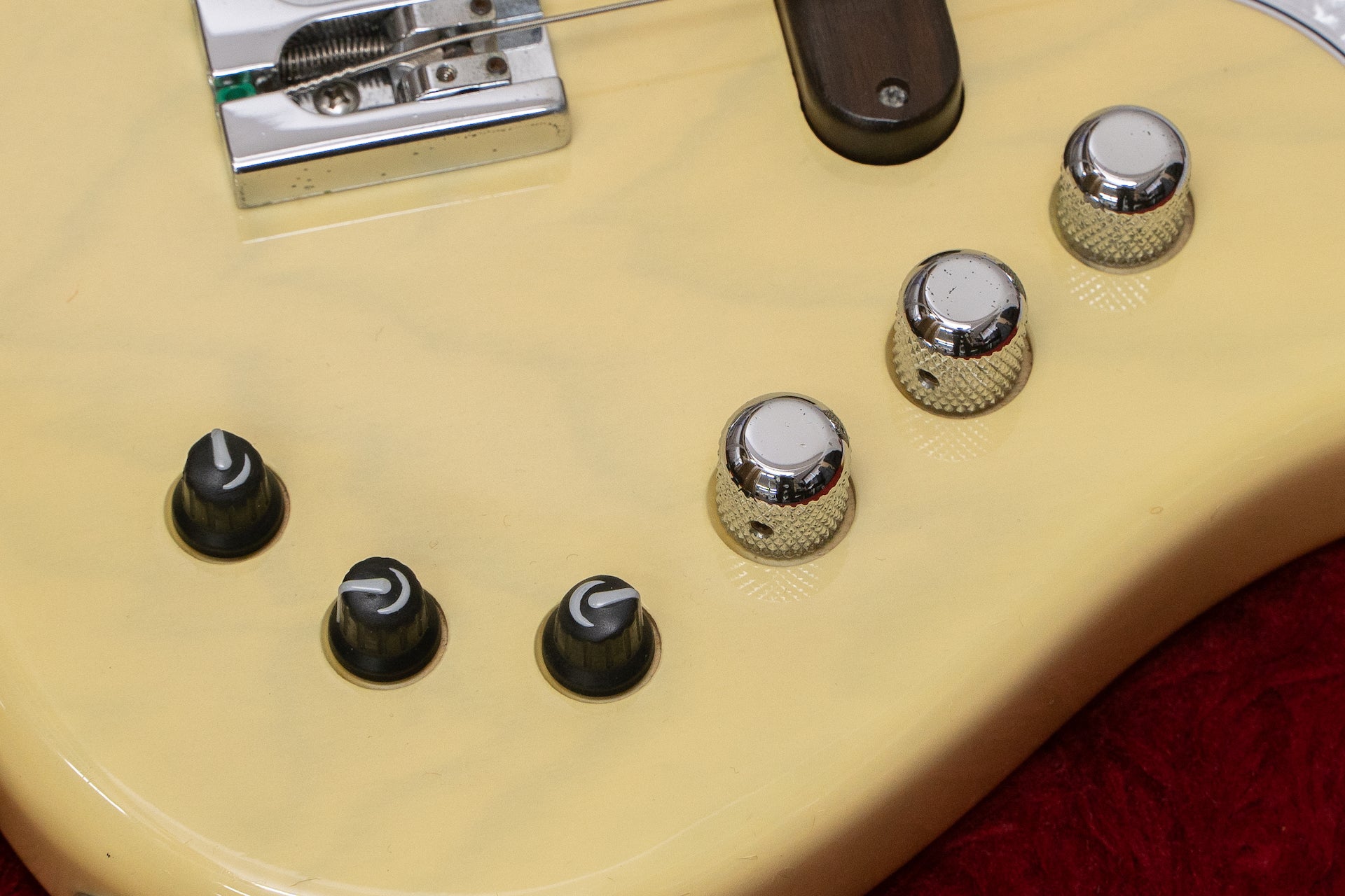 Controls : Master volume (push/pull - active/passive), balancer, master tone, bass, middle, bass, preamp gain (in cavity), middle frequency dip switch (in cavity)