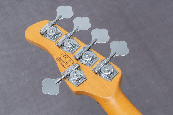 The preamp includes a mid-frequency control. Controls are Volume/Tone, Blender, Treble, Middle/Freq, Bass (passive/active switch).