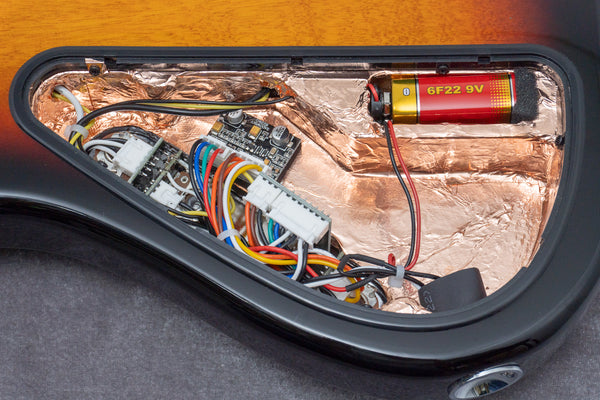 Looking inside the cavity, you'll see copper foil tape applied for shielding. Excellent.
