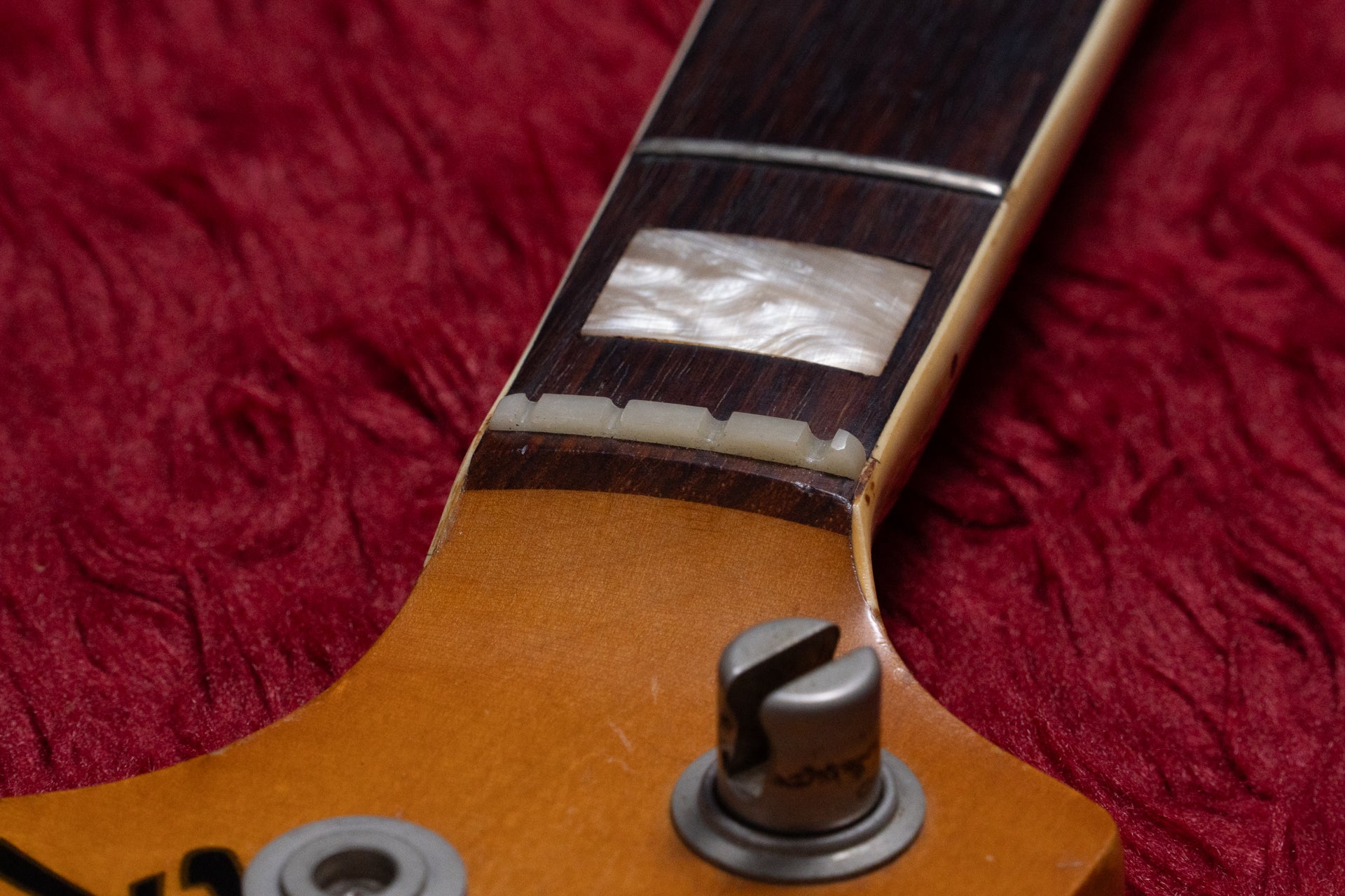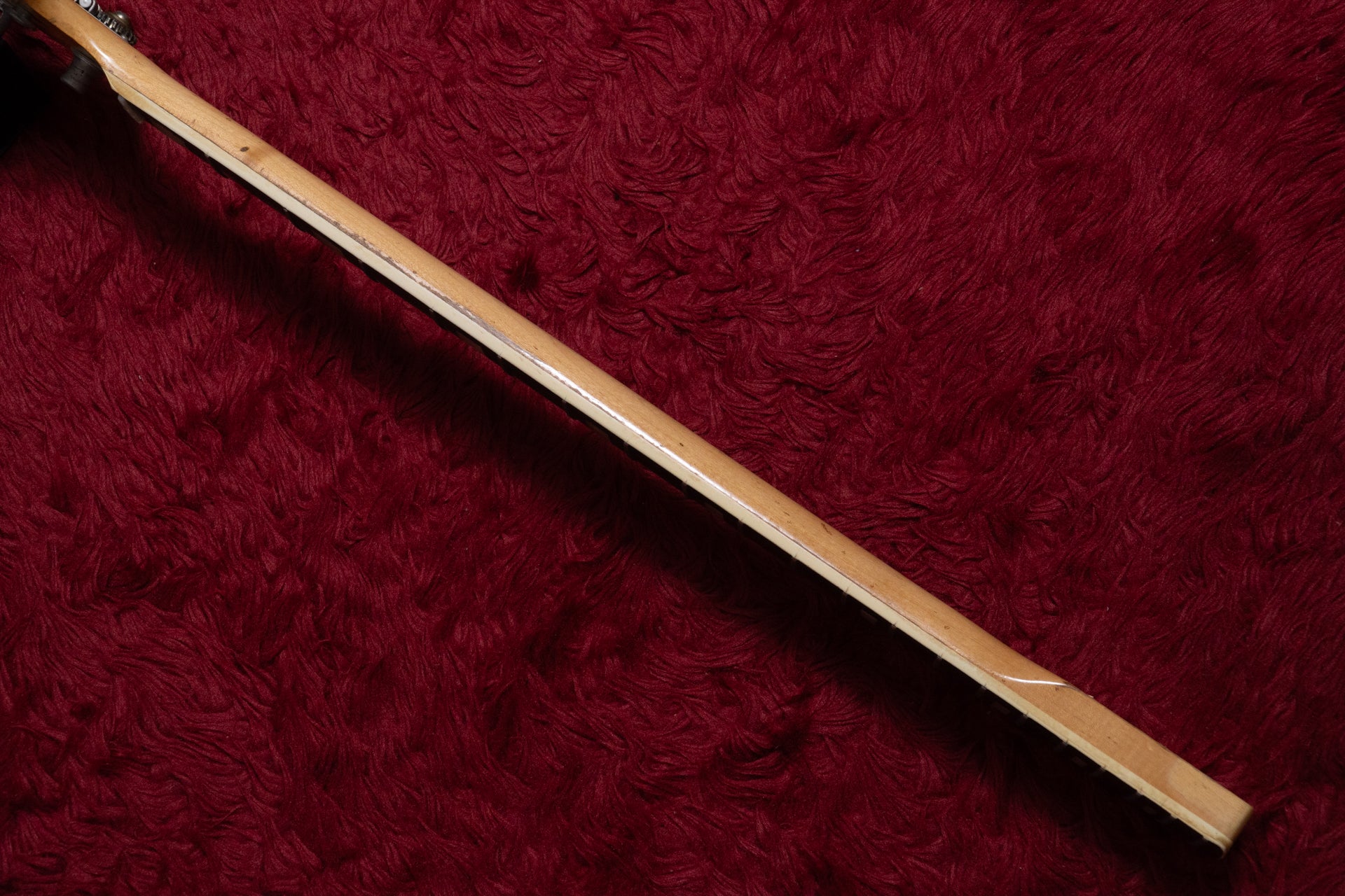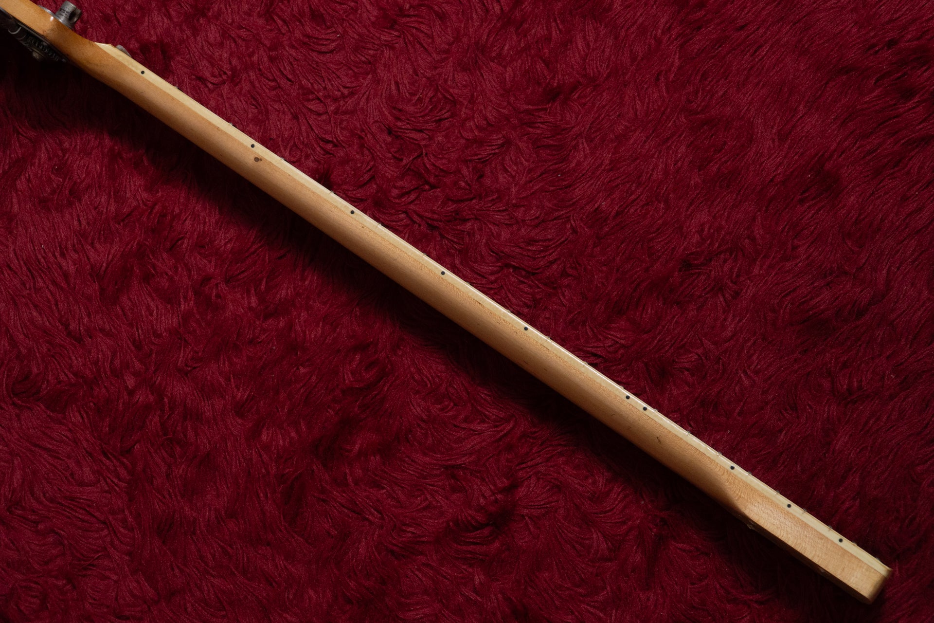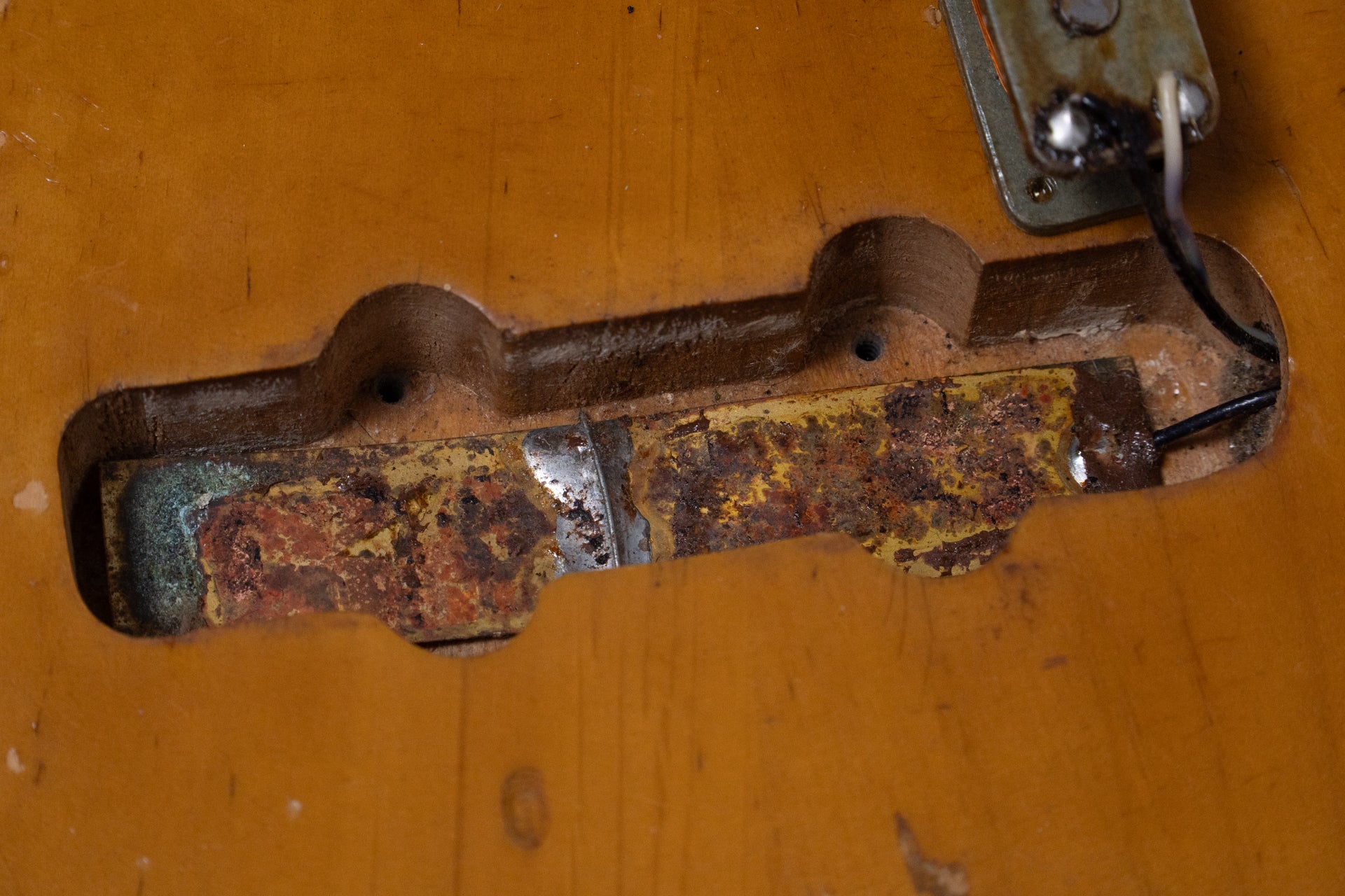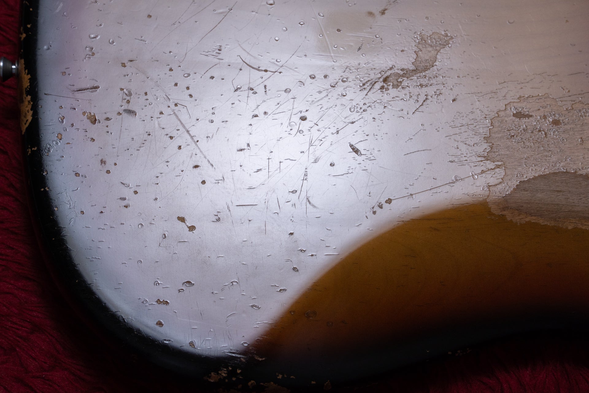 The body and paint show signs of use, including dents, scratches, paint peeling, and feather checking. Metal parts are also tarnished. There are traces of screw holes from where the pickup fence, finger rest, and bridge cover were attached.