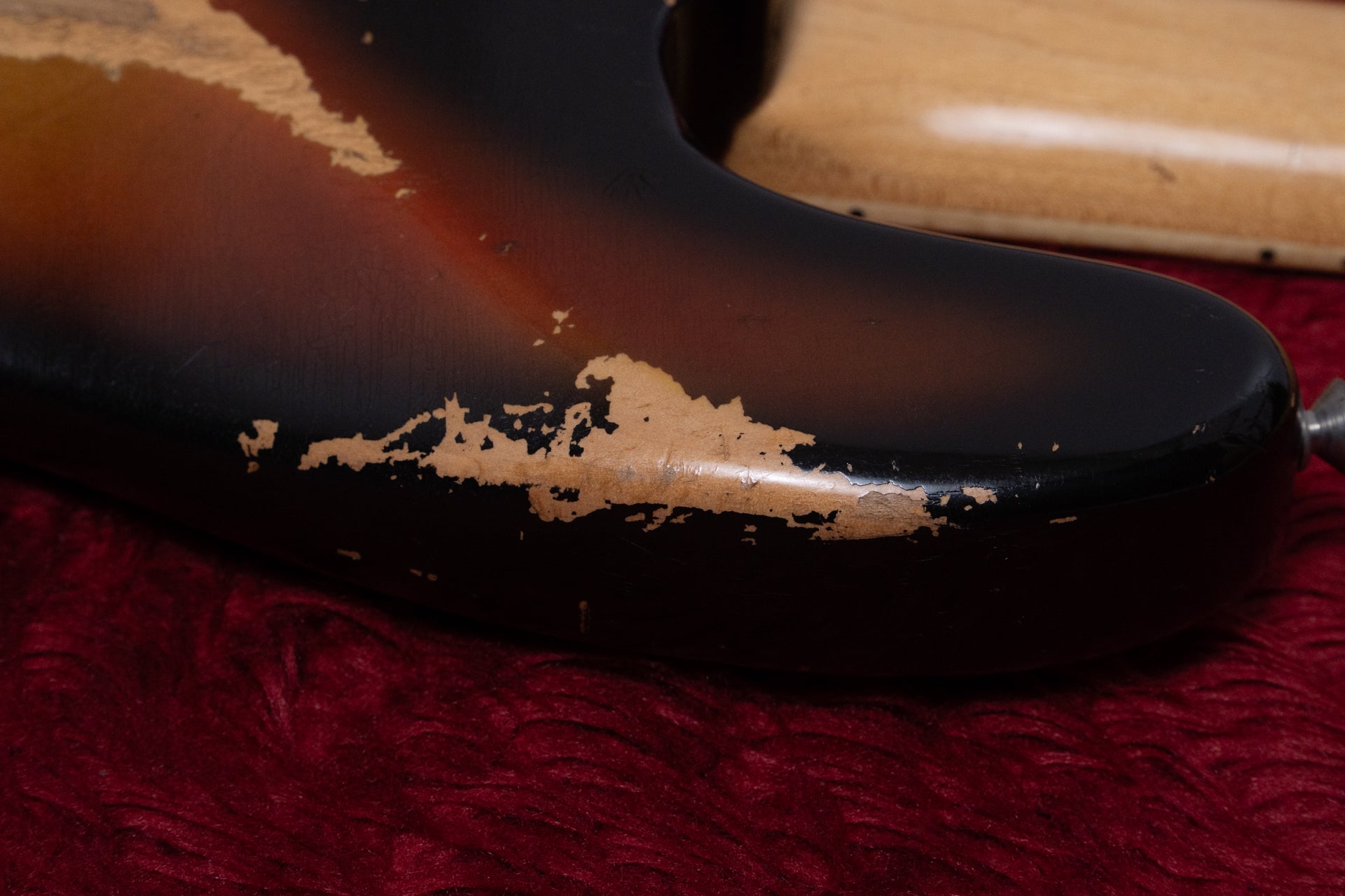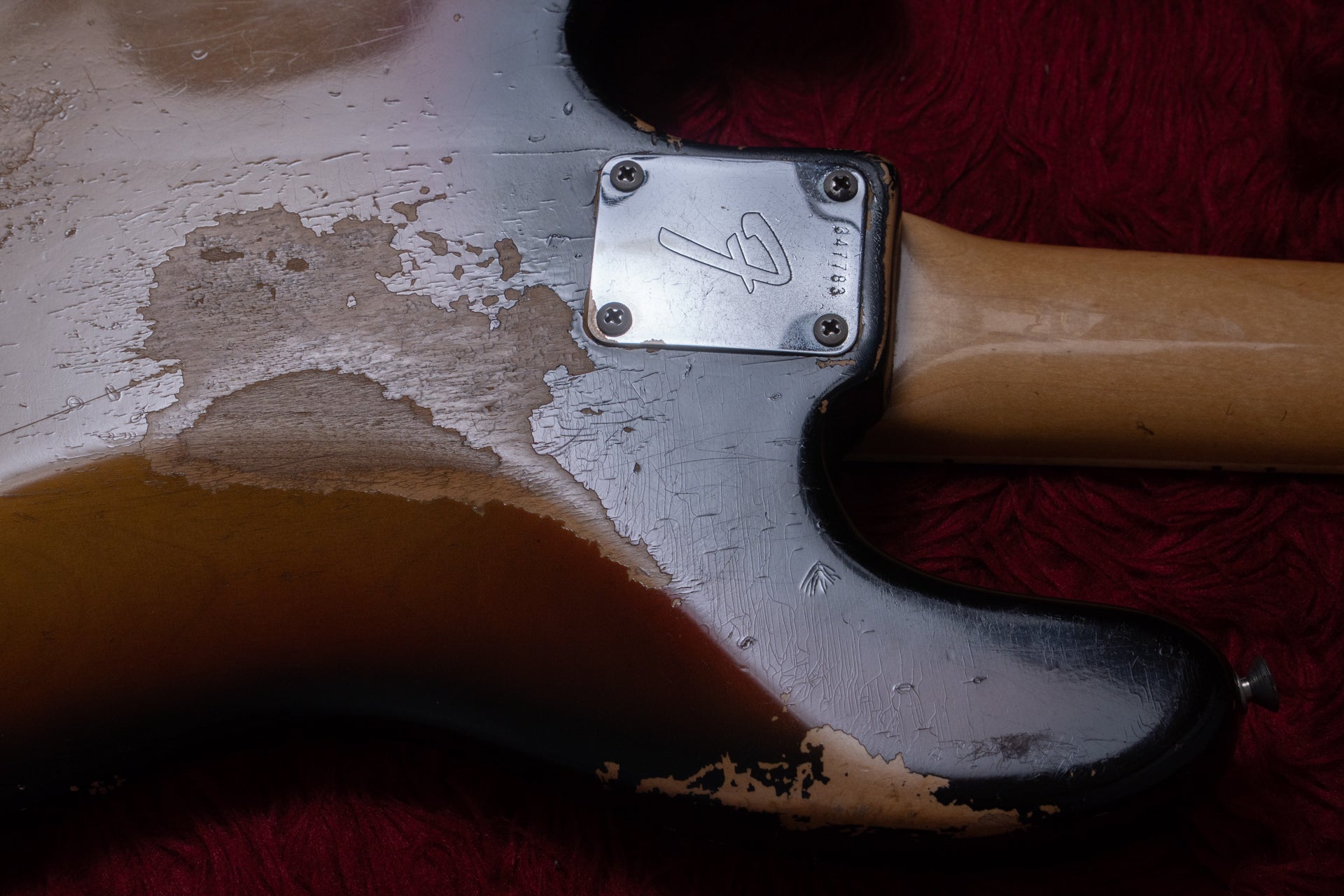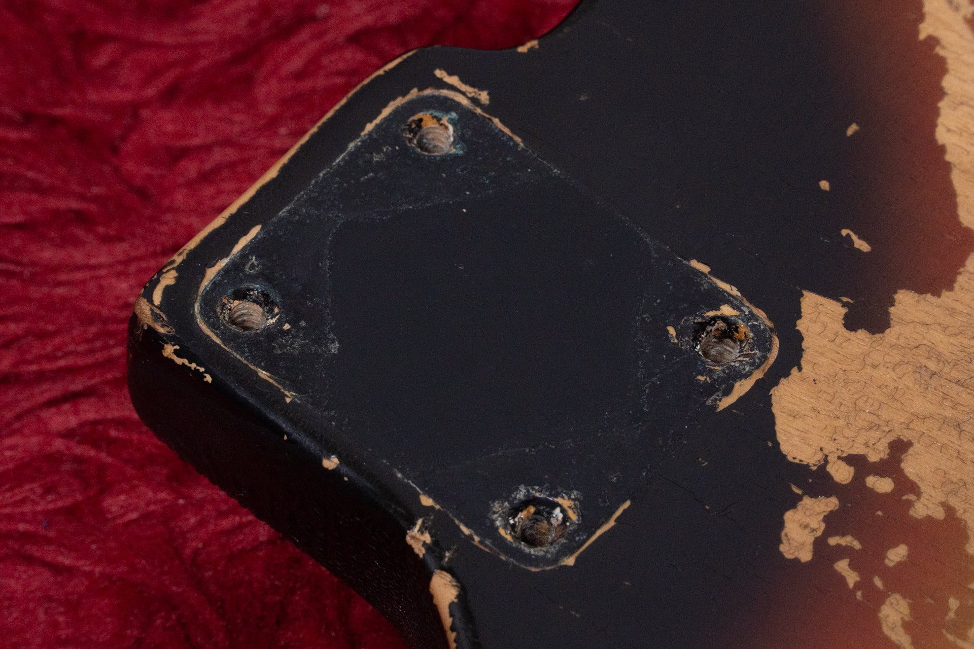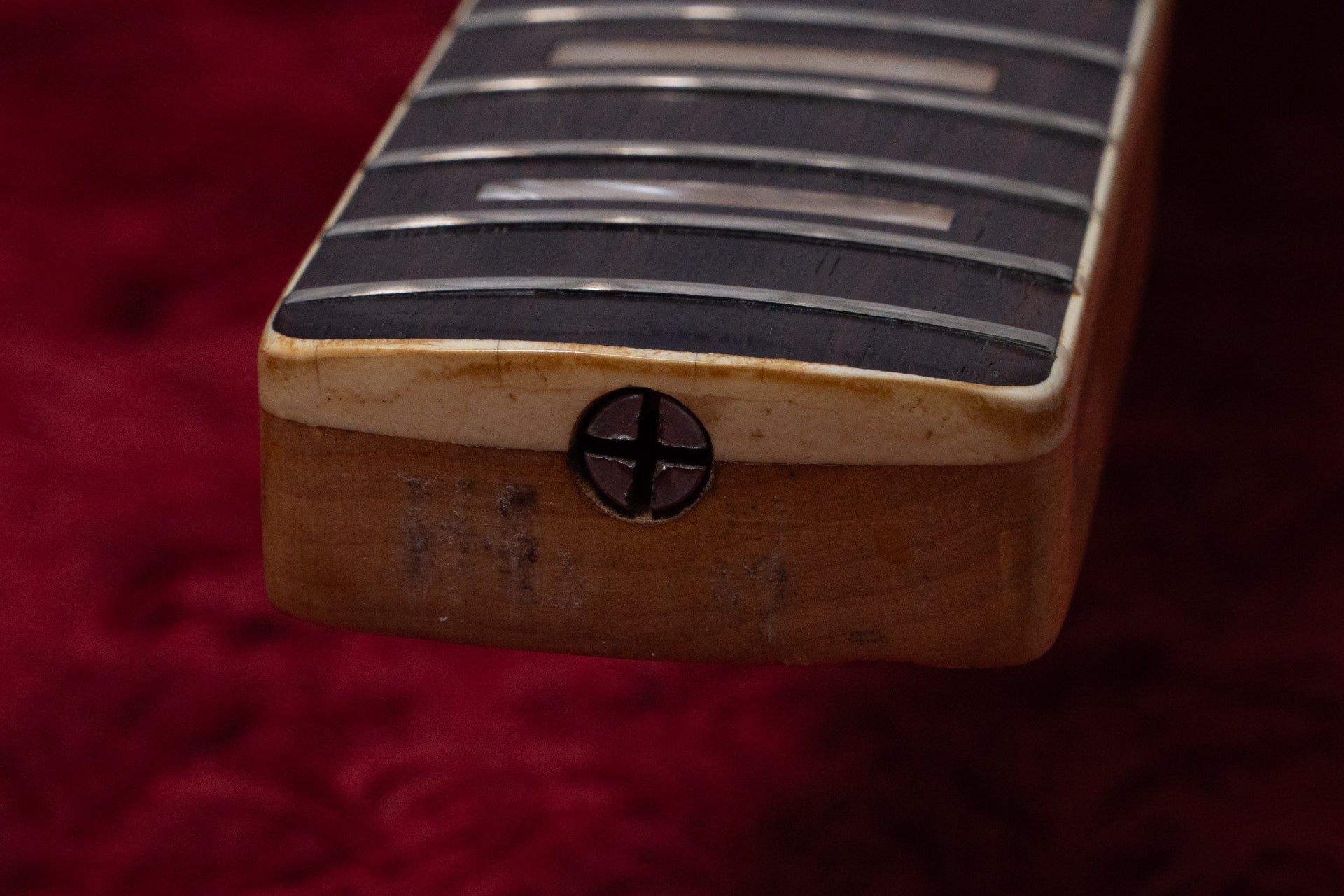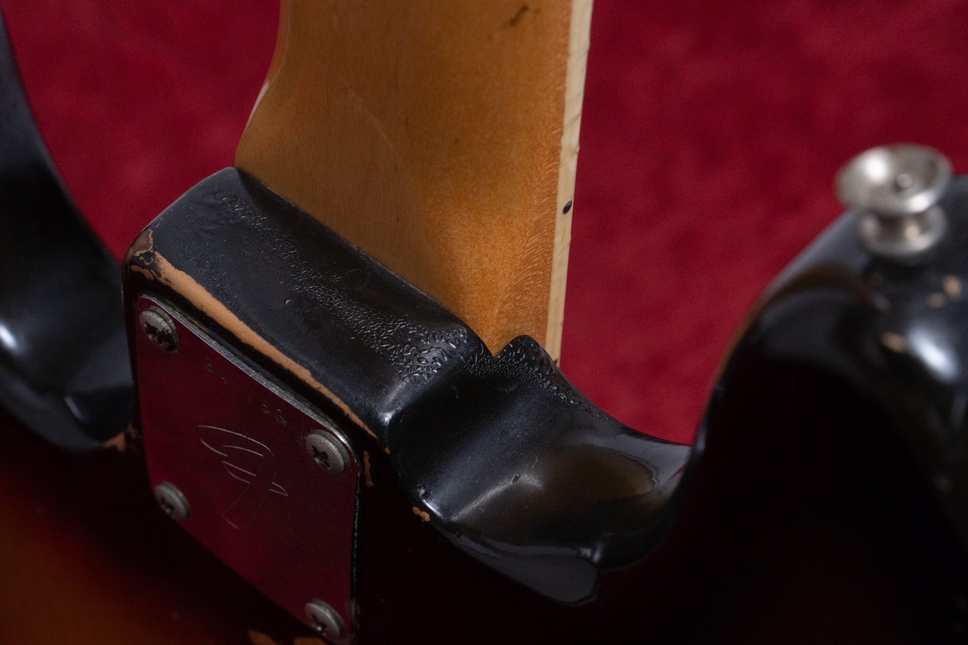 The body and paint show signs of use, including dents, scratches, paint peeling, and feather checking. Metal parts are also tarnished. There are traces of screw holes from where the pickup fence, finger rest, and bridge cover were attached.