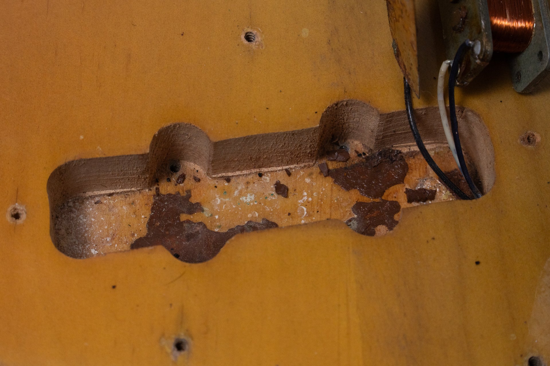 The neck pickup volume pot indicates 1973, the bridge pickup volume pot indicates 1971, and the master tone pot indicates 1971.