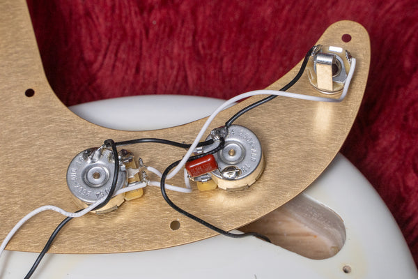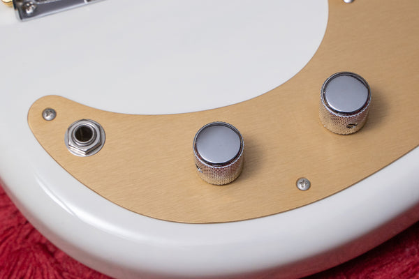 It maintains the iconic features such as the white blonde color, anodized pickguard, spiral saddle, and gloss finished neck.