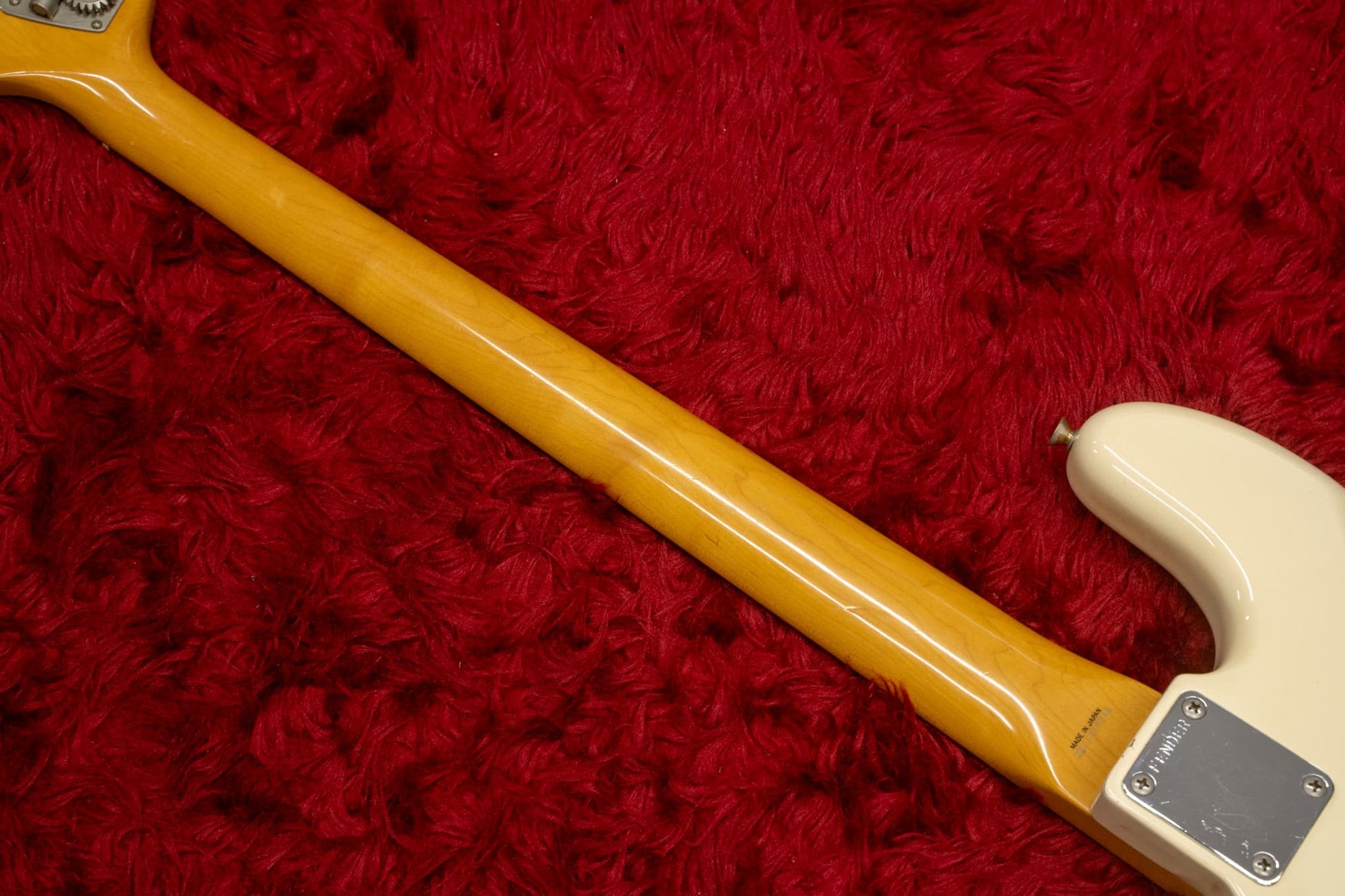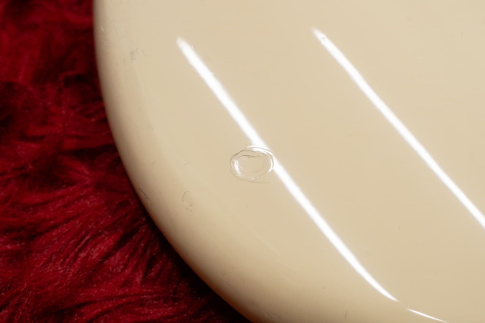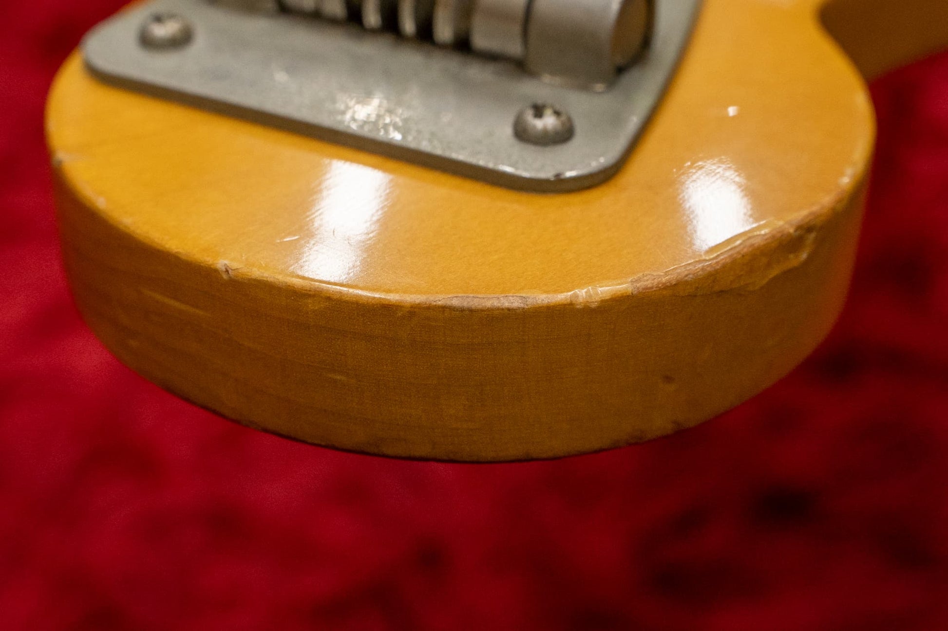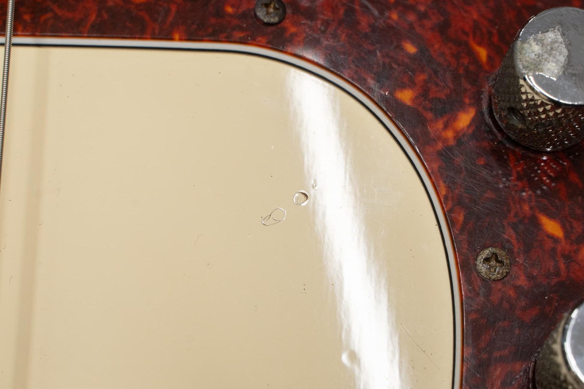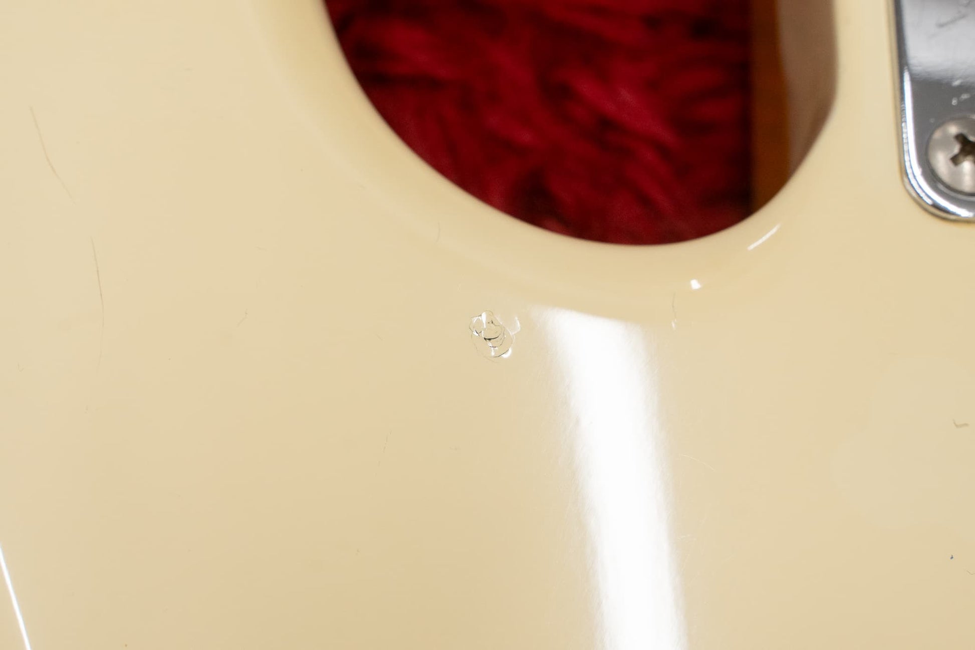 There is one crack in the paint near the neck pocket. There are some areas that are tanned and yellowed. There are some areas that are tanned and yellowed. There are some dullness and peeling of plating on the hard parts. There is evidence that the pilot holes for the pickguard mounting screws were repaired in several places.