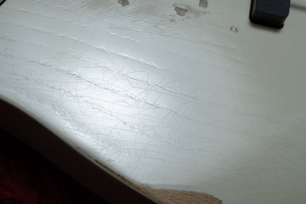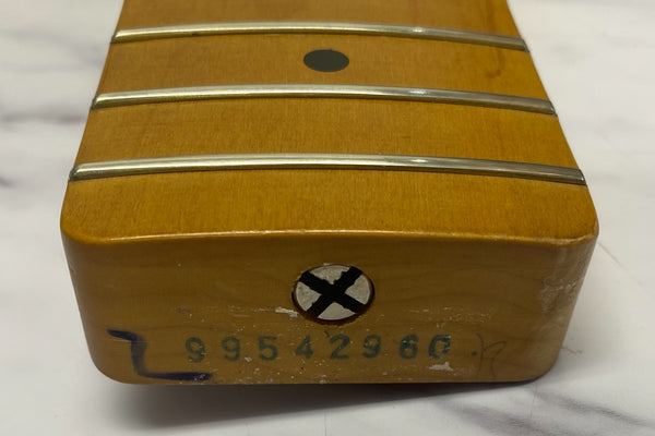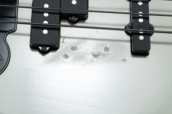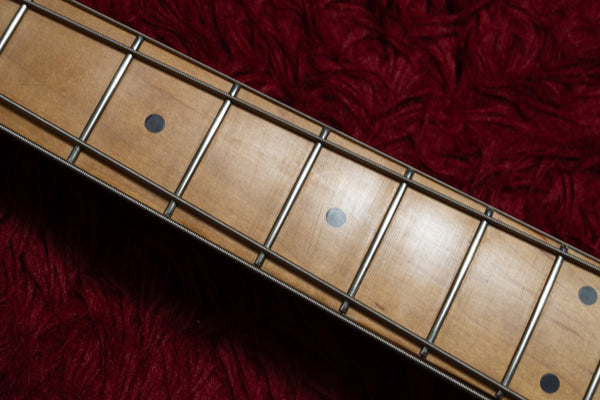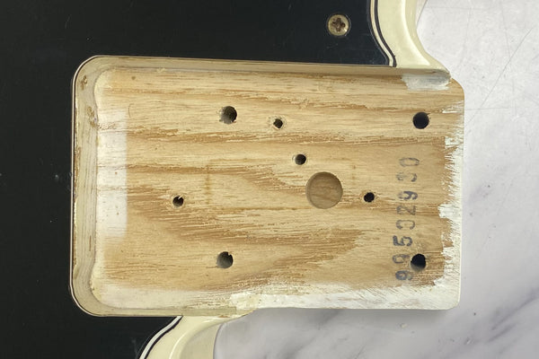 It has been modified to a PJ type, and the pickups have been replaced with EMG-GZR-PJs. The pots have also been replaced, and one pickguard mounting screw has been replaced.
