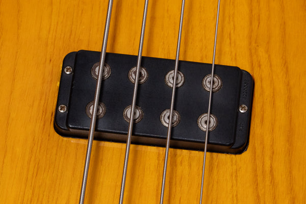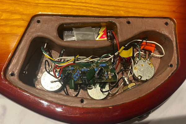 Controls: Master volume, treble, bass, PU wiring selector switch (series/parallel), active/passive selector switch