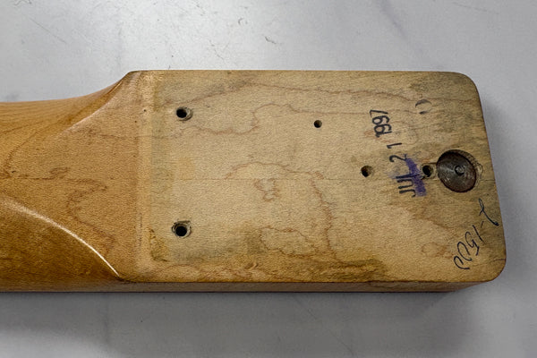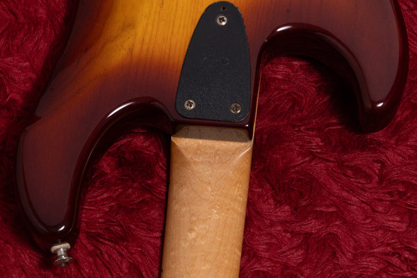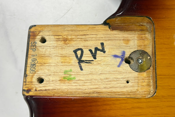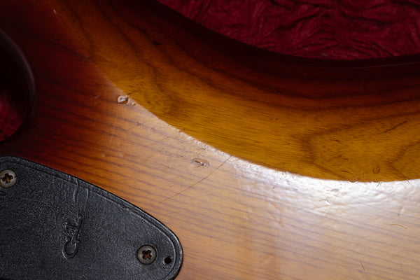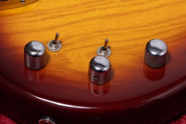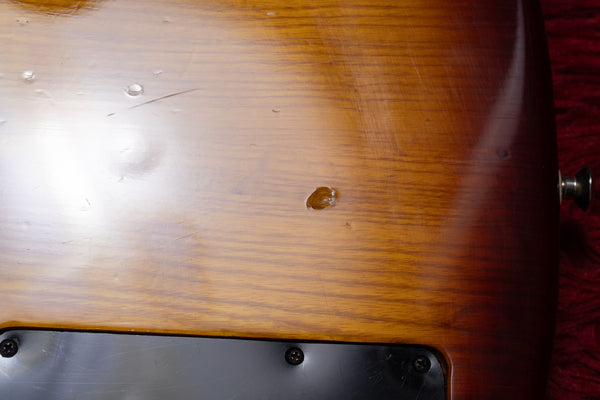 The strap pins have been replaced with Jim Dunlop ones. The nut has been replaced. The bass knob has been replaced, so it is tilted, but this does not affect playability.